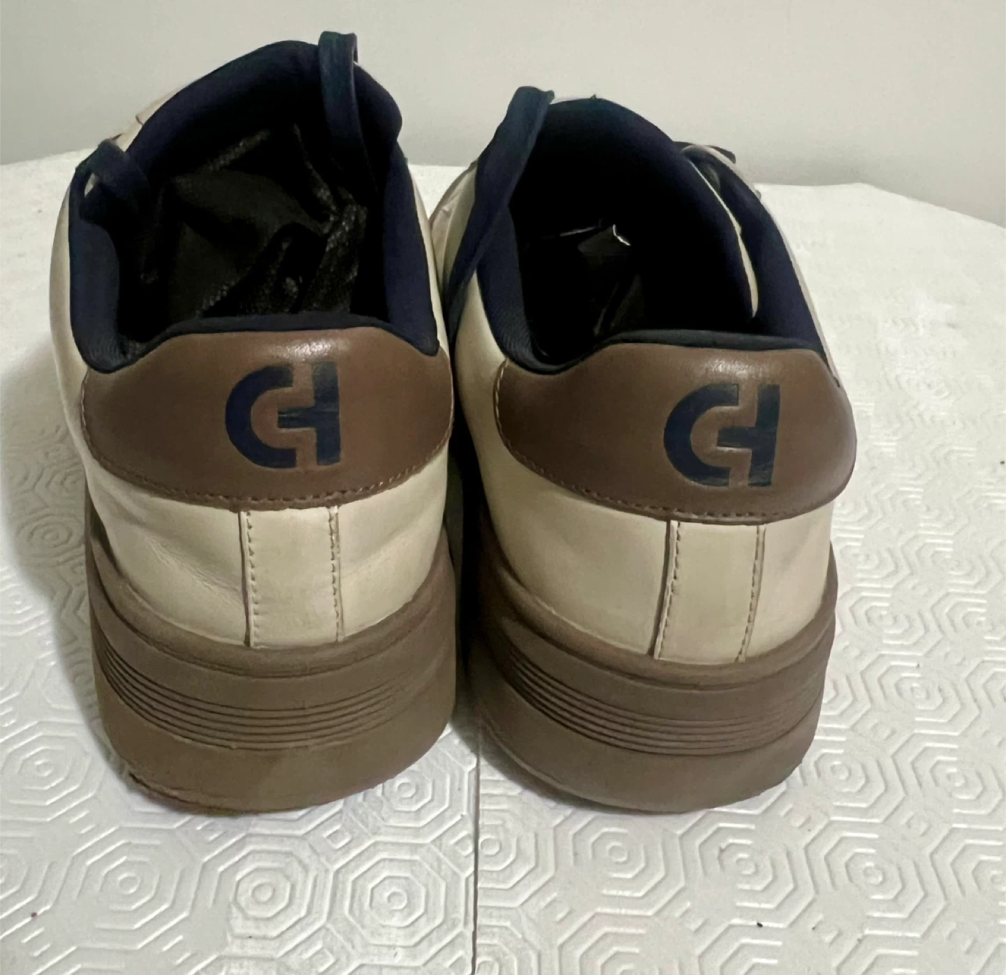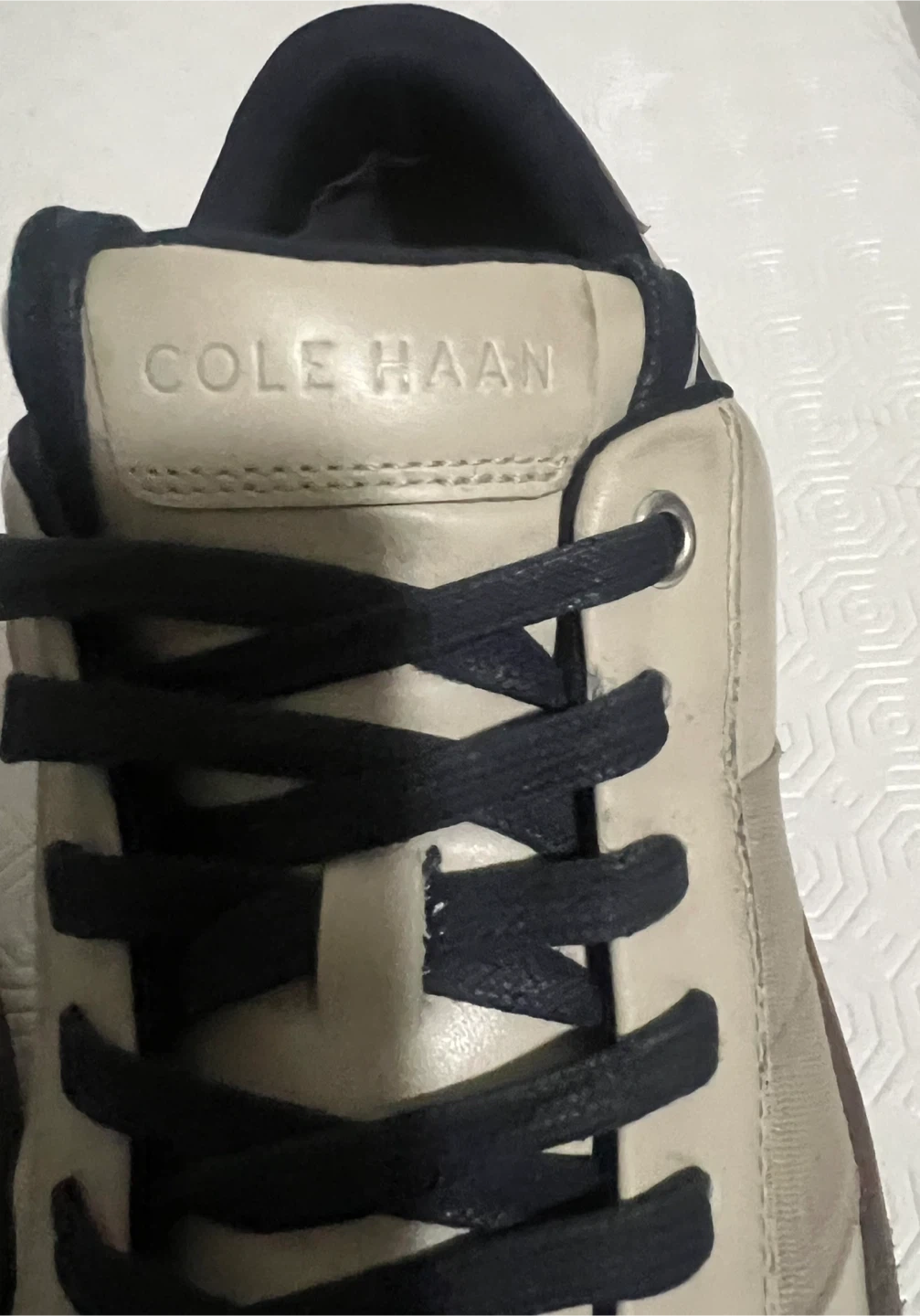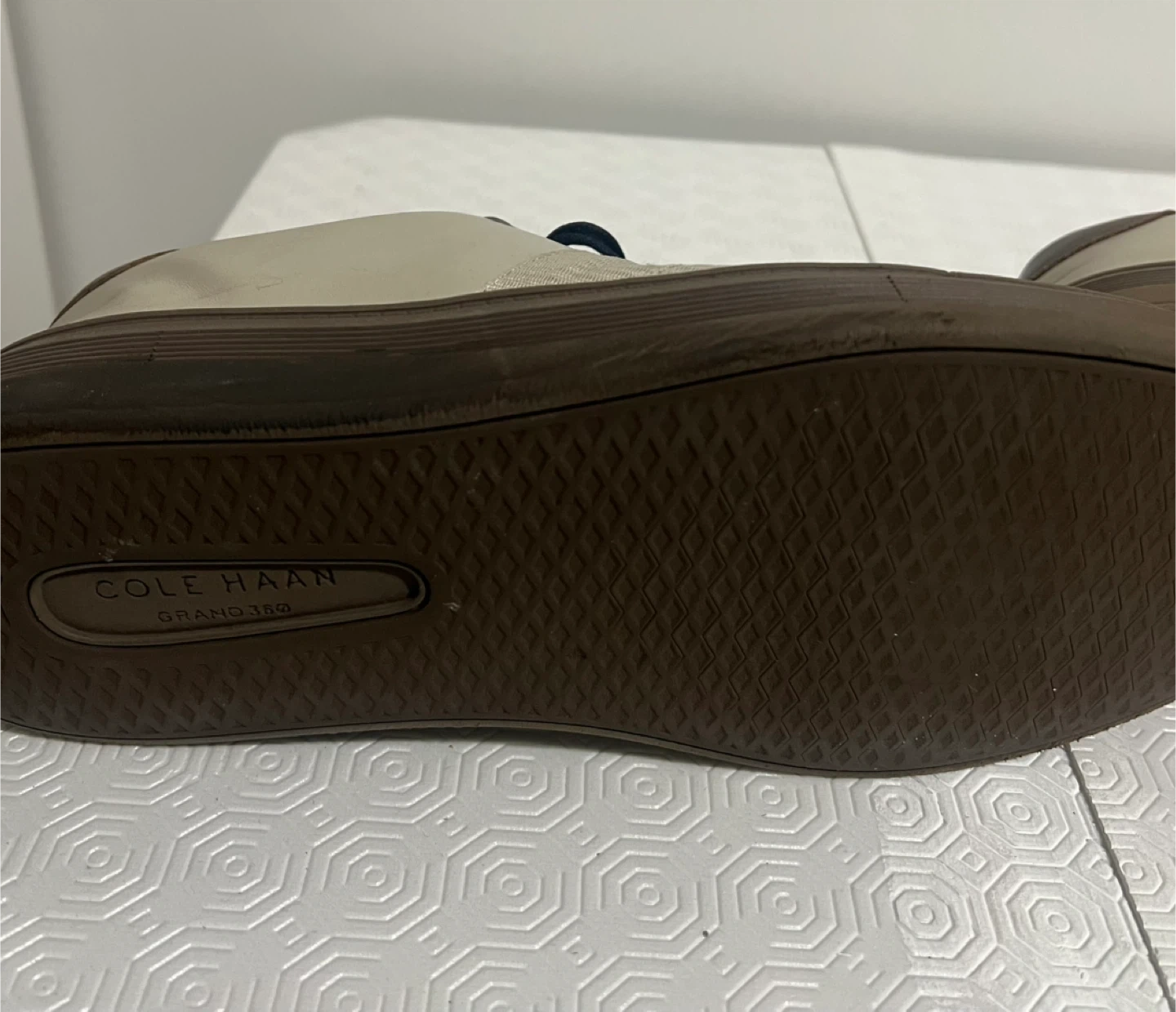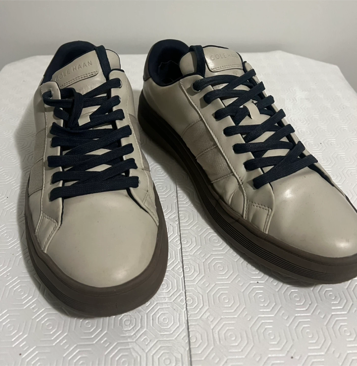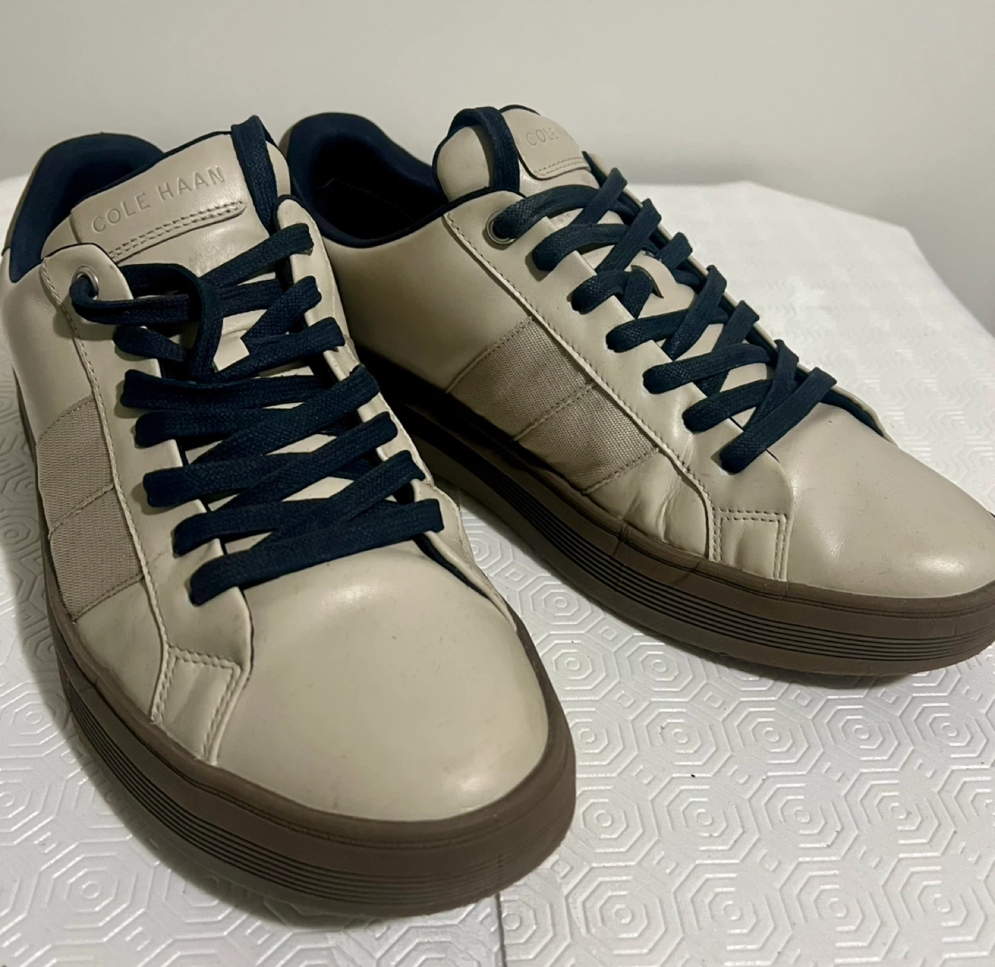 Cole Haan men's sneakers in a light beige colour. Features dark blue laces and trim with a brown sole. Made in Vietnam. Size is 10.5 men's.