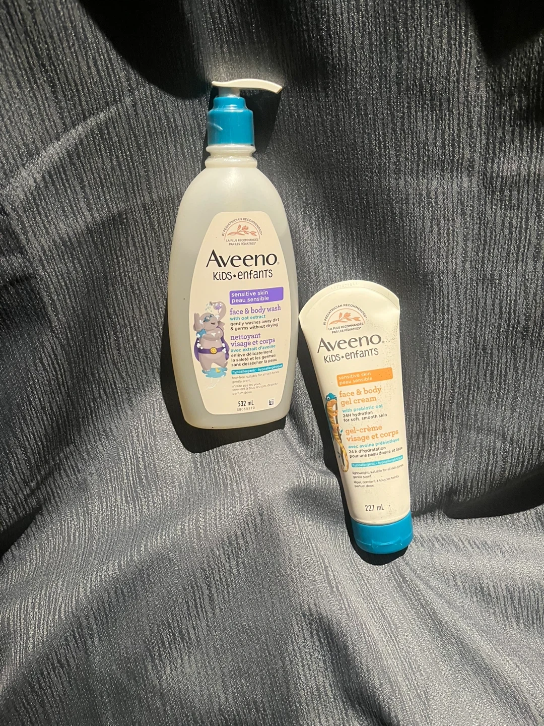 This Aveeno Kids set includes a 332ml face & body wash and a 227ml face & body gel cream. Both are formulated for sensitive skin. They gently wash away dirt and provide 24-hour hydration. Great for kids' daily skincare routine!
