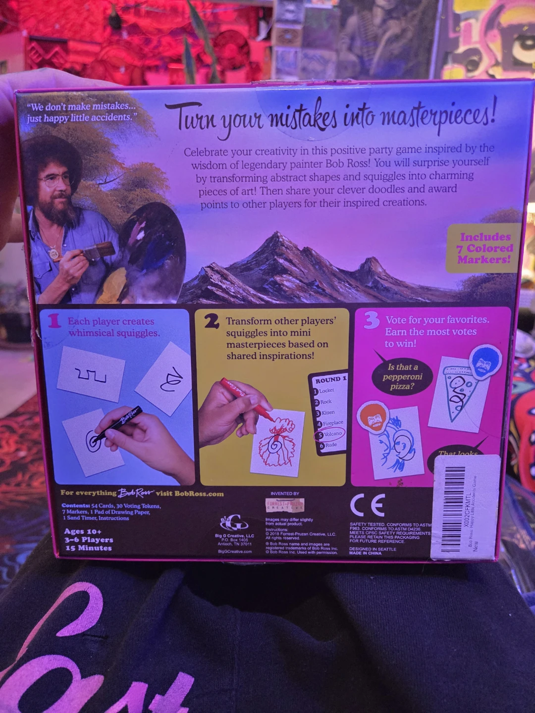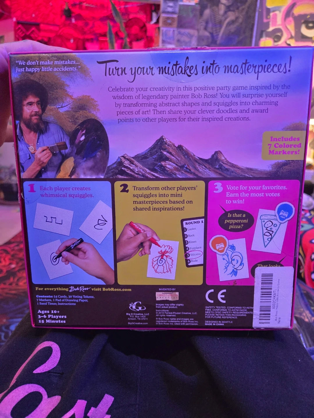 Celebrate your creativity with this Bob Ross inspired party game! Turn your mistakes into masterpieces by transforming squiggles into charming pieces of art. The game includes coloured markers. Recommended for ages 10+, for 3-6 players. Includes everything you need to get started!