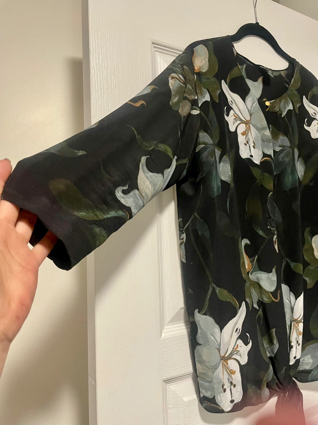 This Club Monaco blouse has a beautiful floral print on a black background. It's made of 100% silk and features a tie-front detail. The size is M/M. A lovely piece for dressing up or down!