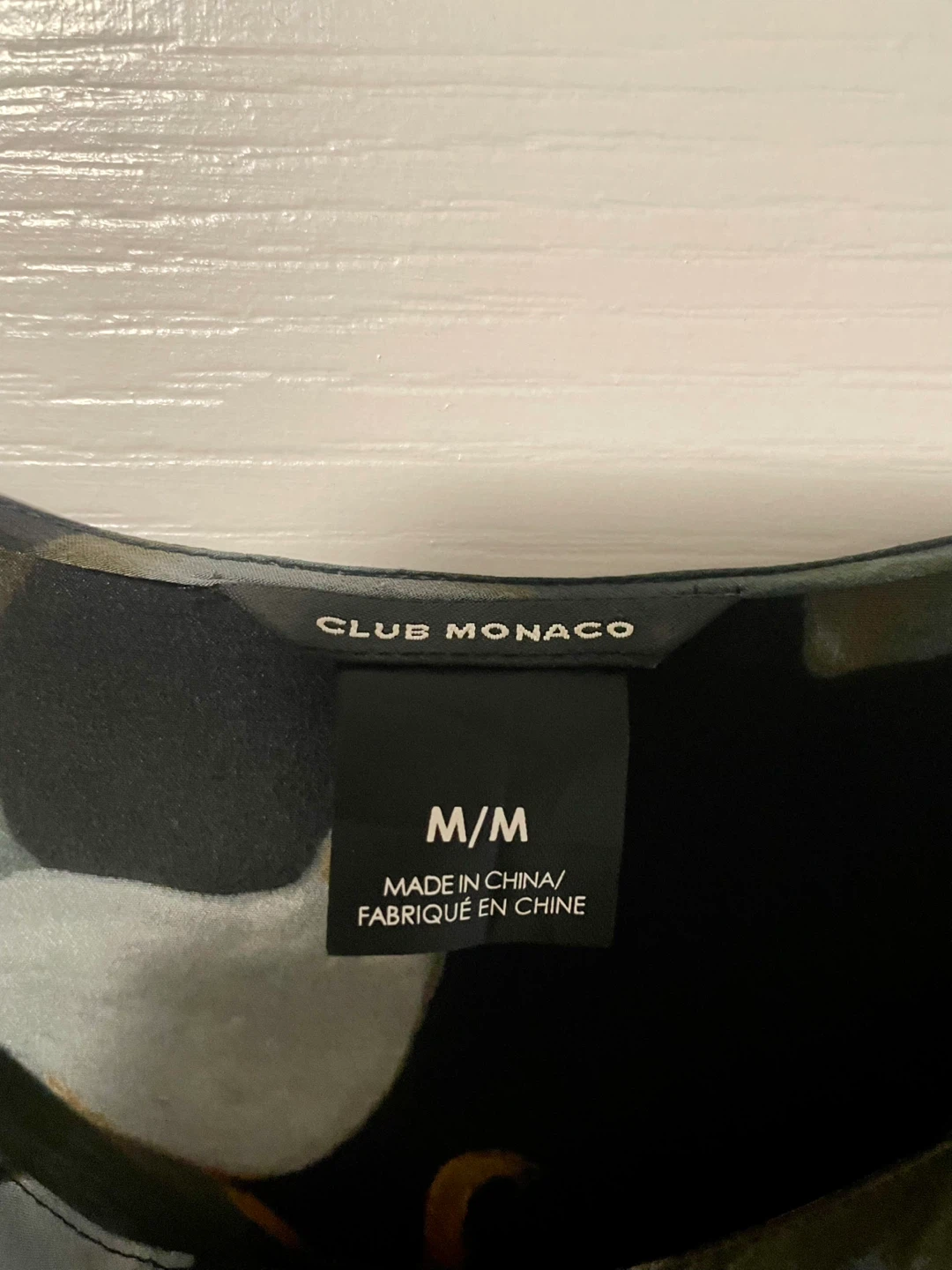 This Club Monaco blouse has a beautiful floral print on a black background. It's made of 100% silk and features a tie-front detail. The size is M/M. A lovely piece for dressing up or down!