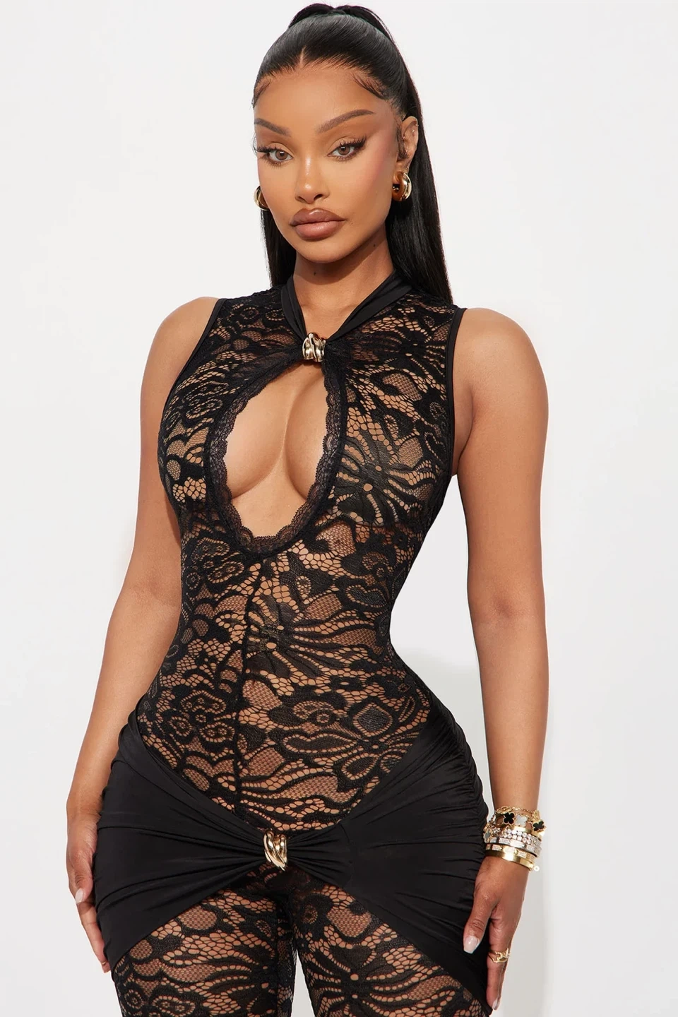 Turn heads in this stunning Fashion Nova Come Closer Lace Flare Leg Jumpsuit in classic black.