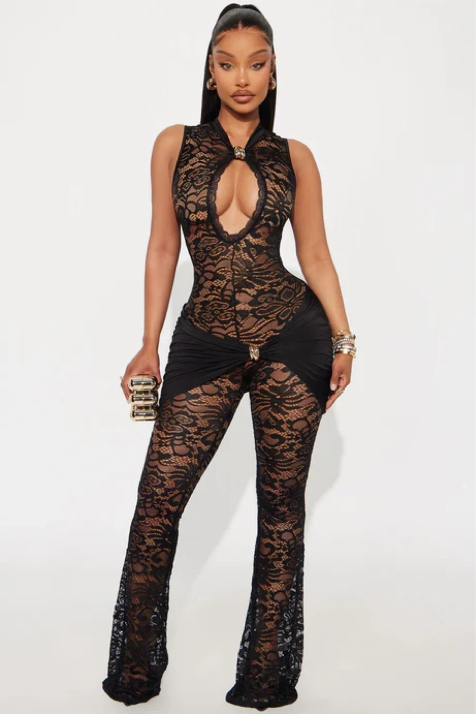 Turn heads in this stunning Fashion Nova Come Closer Lace Flare Leg Jumpsuit in classic black.