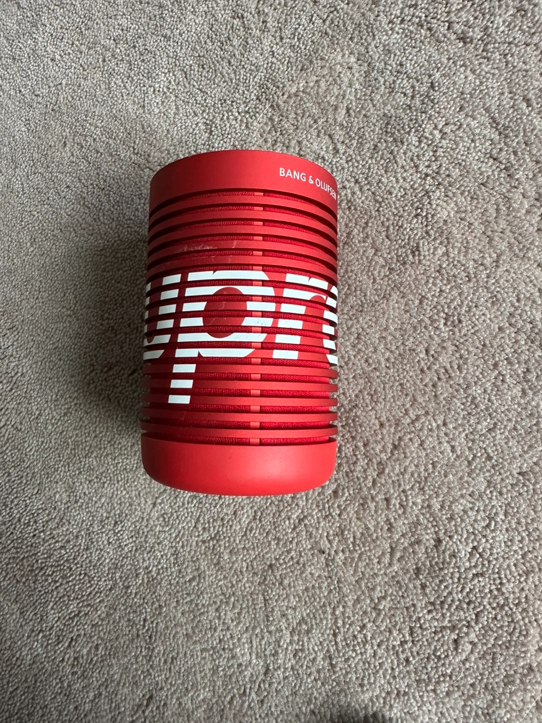 Red speaker. Cylindrical shape. Features the Supreme logo. Includes buttons on top. A great way to enjoy your favourite music wherever you are.