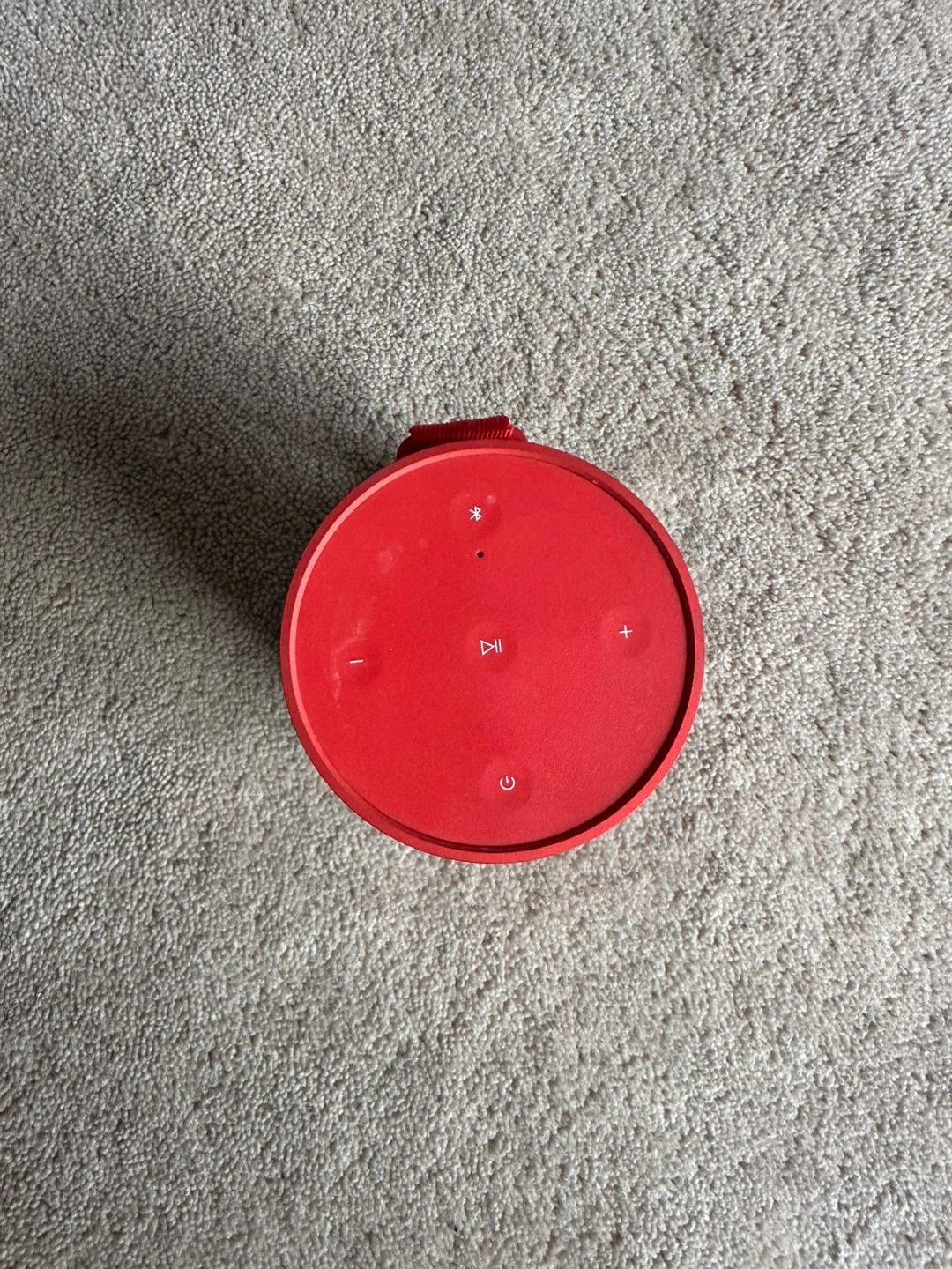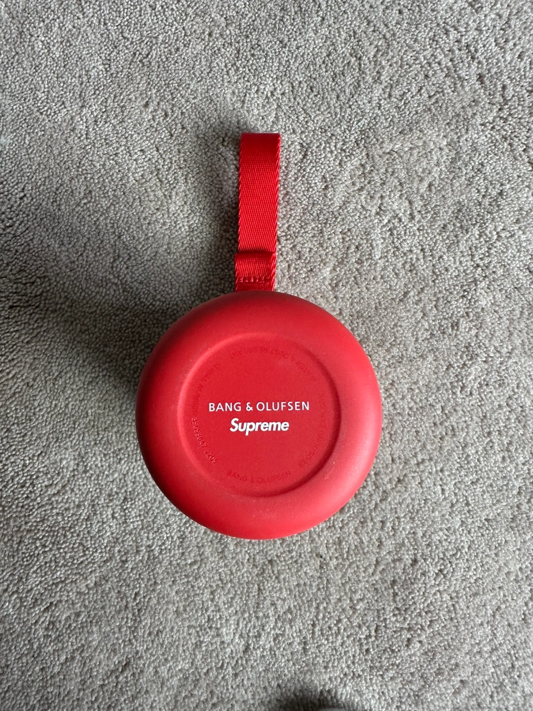 Red speaker. Cylindrical shape. Features the Supreme logo. Includes buttons on top. A great way to enjoy your favourite music wherever you are.