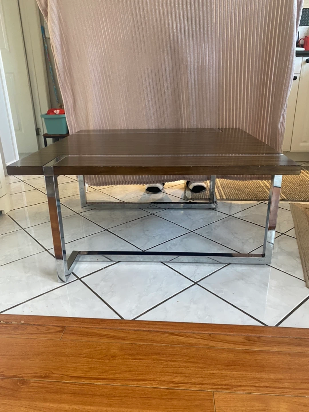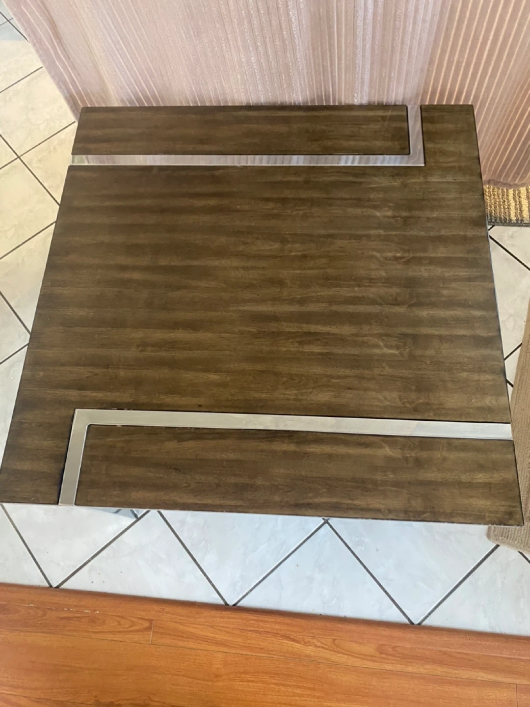 This end table features a dark wood top with silver accents. It's supported by sturdy chrome legs, giving it a modern look. It's a great size for placing next to a sofa or chair.