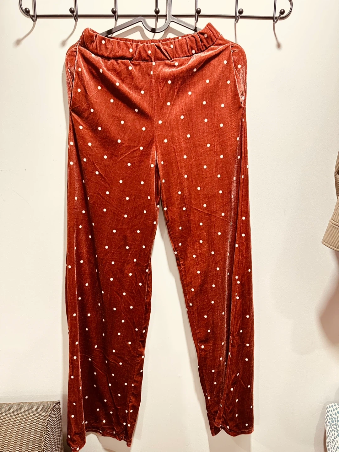 These rust-coloured velour pants feature a white polka dot pattern. They have an elastic waistband for a comfortable fit. Made from a soft velour material.