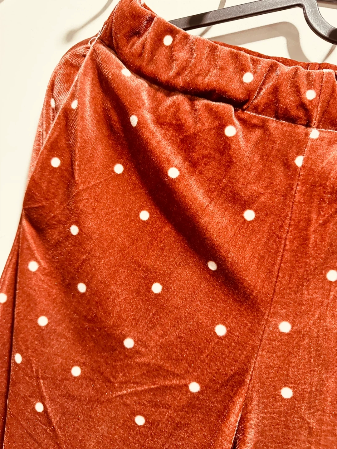 These rust-coloured velour pants feature a white polka dot pattern. They have an elastic waistband for a comfortable fit. Made from a soft velour material.