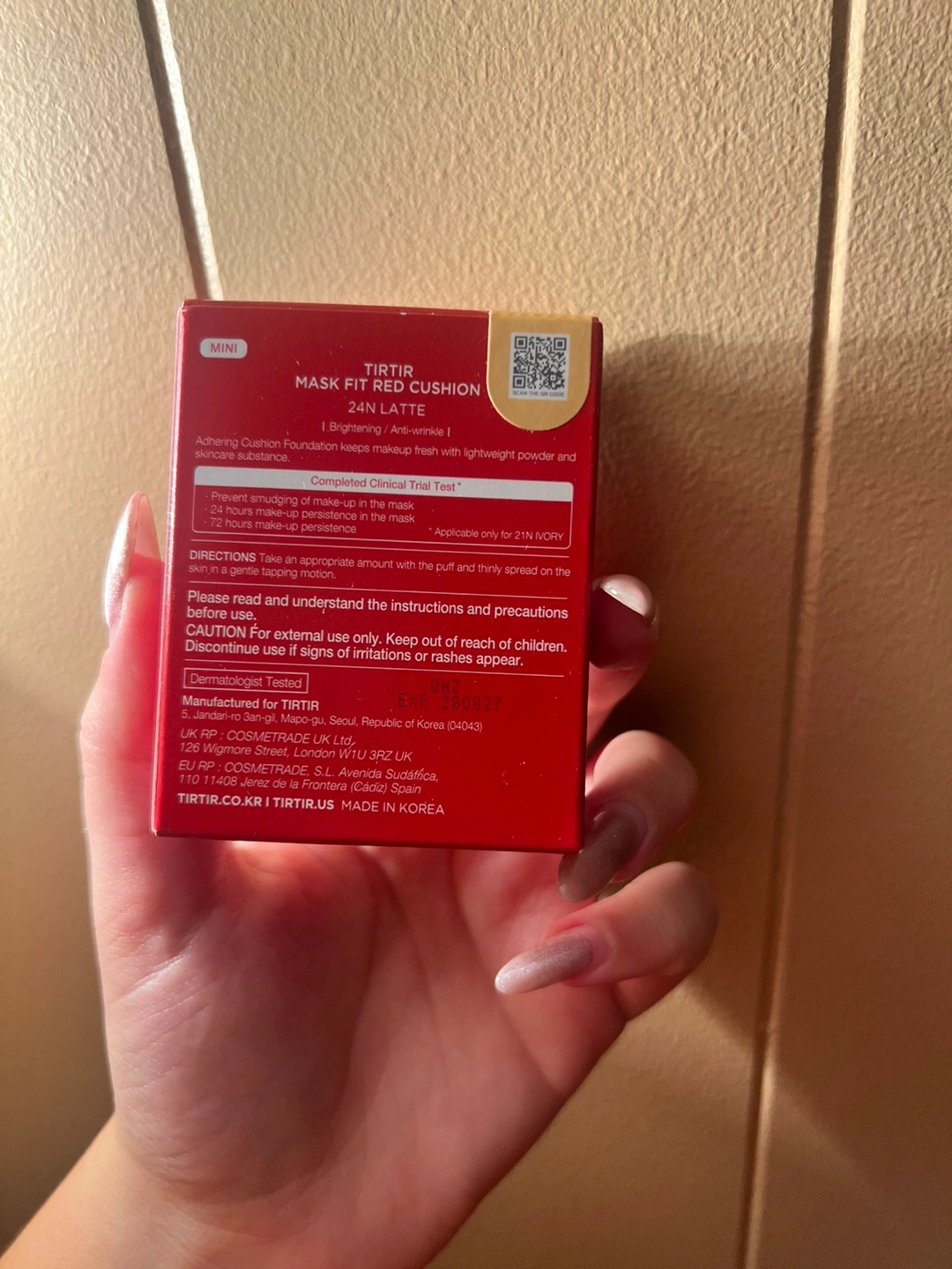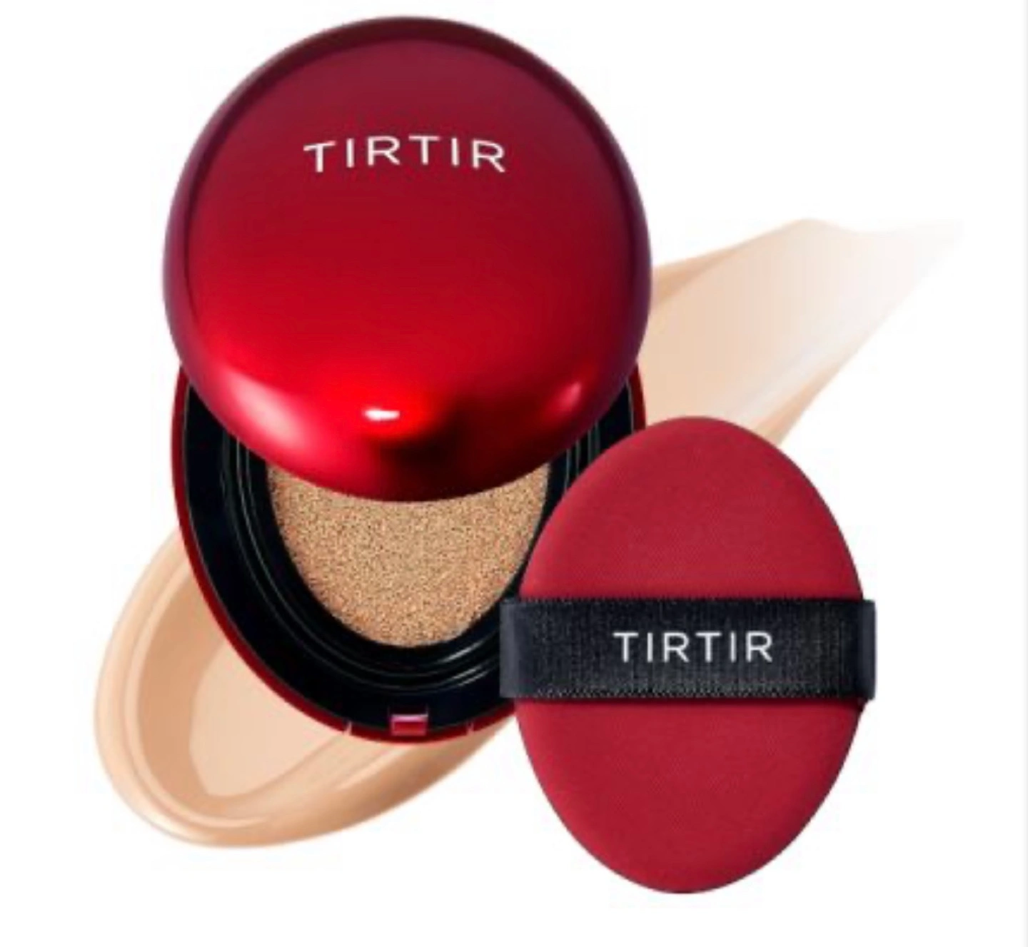 Selling a TIRTIR Mask Fit Red Cushion in the shade 24N Latte! This cushion provides mask shield enriched coverage and helps with brightening and anti-wrinkle benefits. It's designed to keep your makeup fresh with a lightweight powder and skincare substance. The expiration date is 2028 August 27