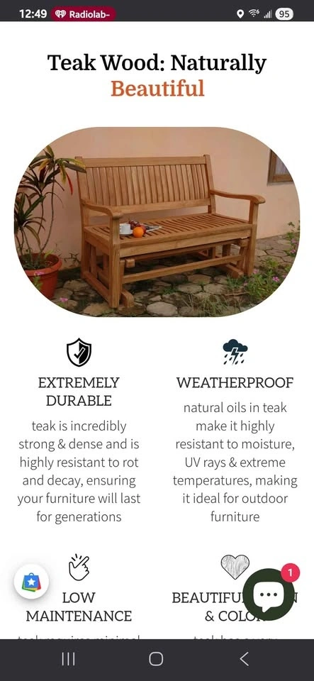 A teak wood glider bench combines the relaxing motion of a glider with the superior qualities of teak wood. Little to no maintenance needed. It can withstand outdoor weather. For ages to come or you can simply clean the bench and add an oil based sealer to maintain it's your original color.