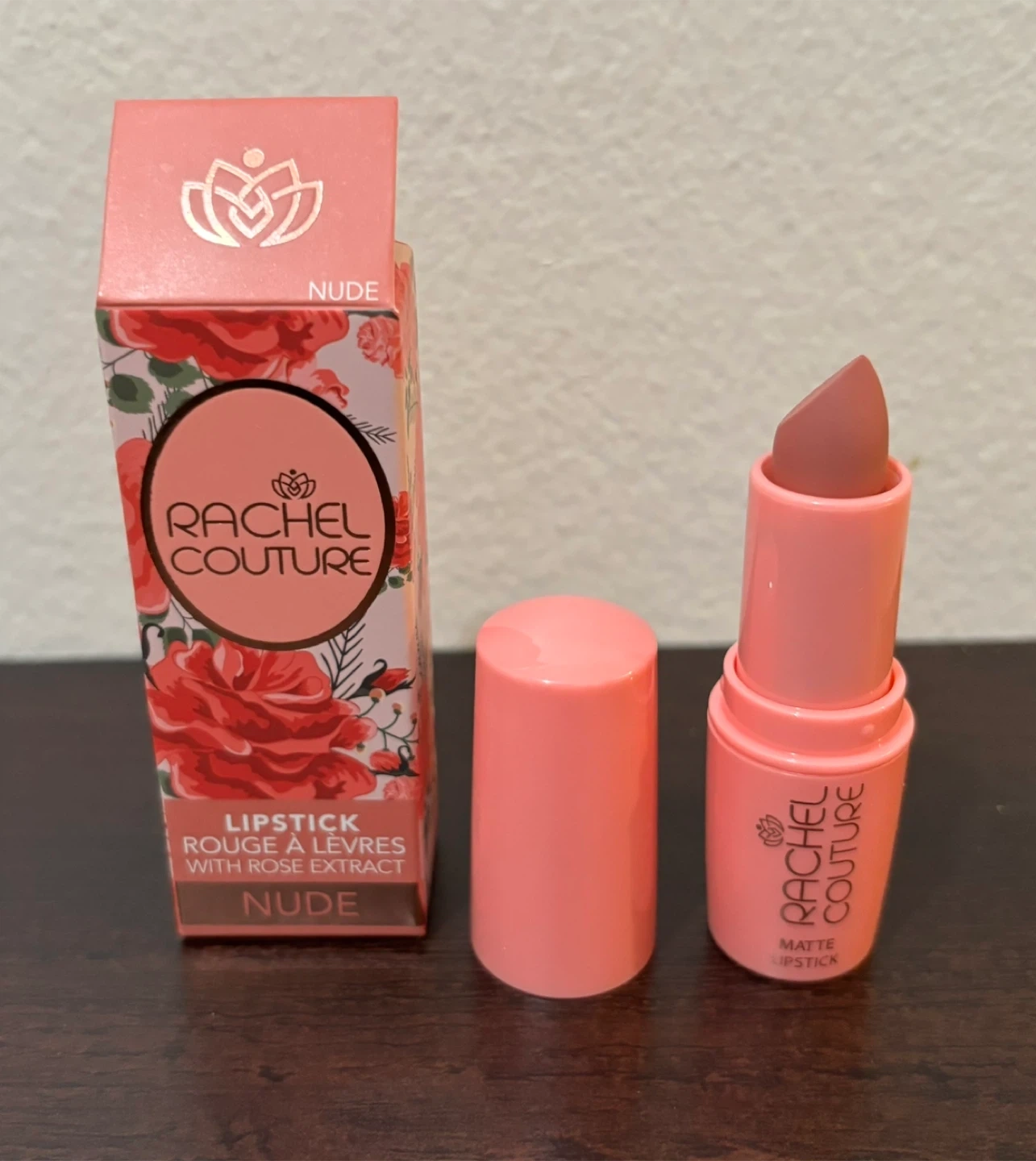 This is a Rachel Couture matte lipstick in the shade Nude. It's formulated with rose extract. The lipstick comes with its original box.