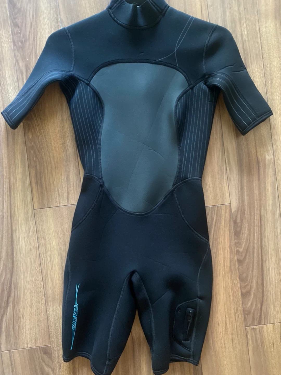 Selling a MEC women's wetsuit in size 4. The material is 85% nylon and 15% spandex for the face, and 100% polychloroprene for the rubber/caoutchouc. The backer/envers is 100% nylon. Worn once Excellent condition