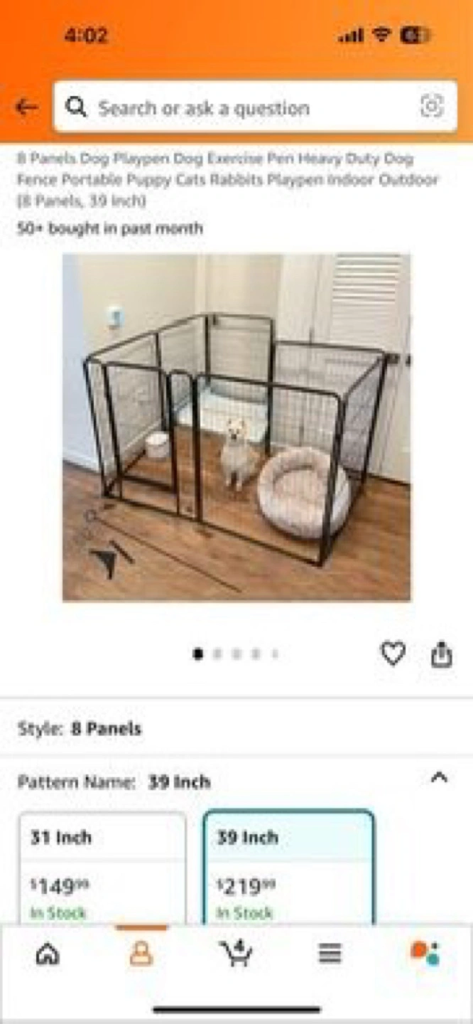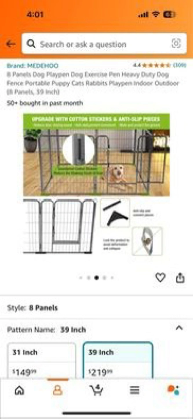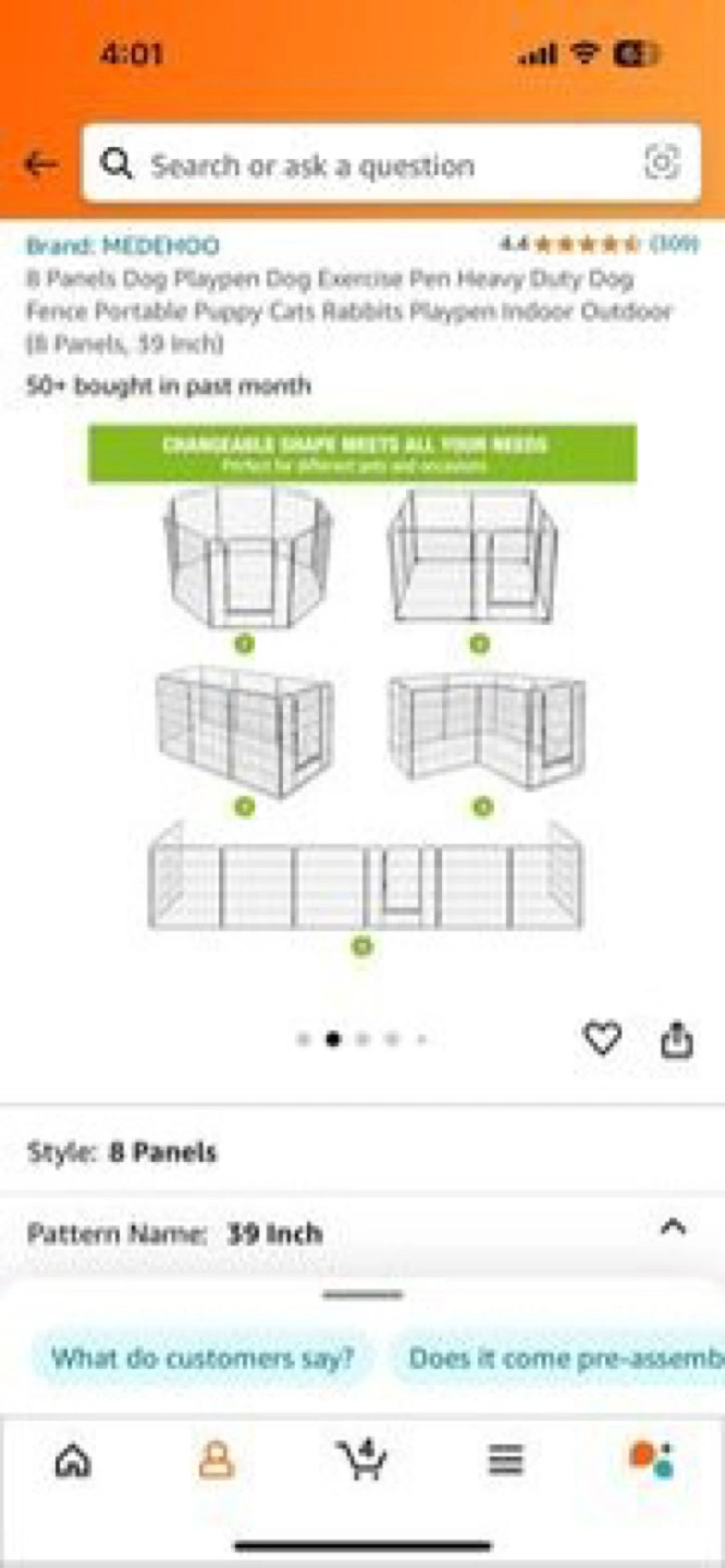 5Heavy-duty dog fence. Portable playpen for dogs, cats, and rabbits. Indoor or outdoor use. Eight panels, 39 inch height. Changeable shape.