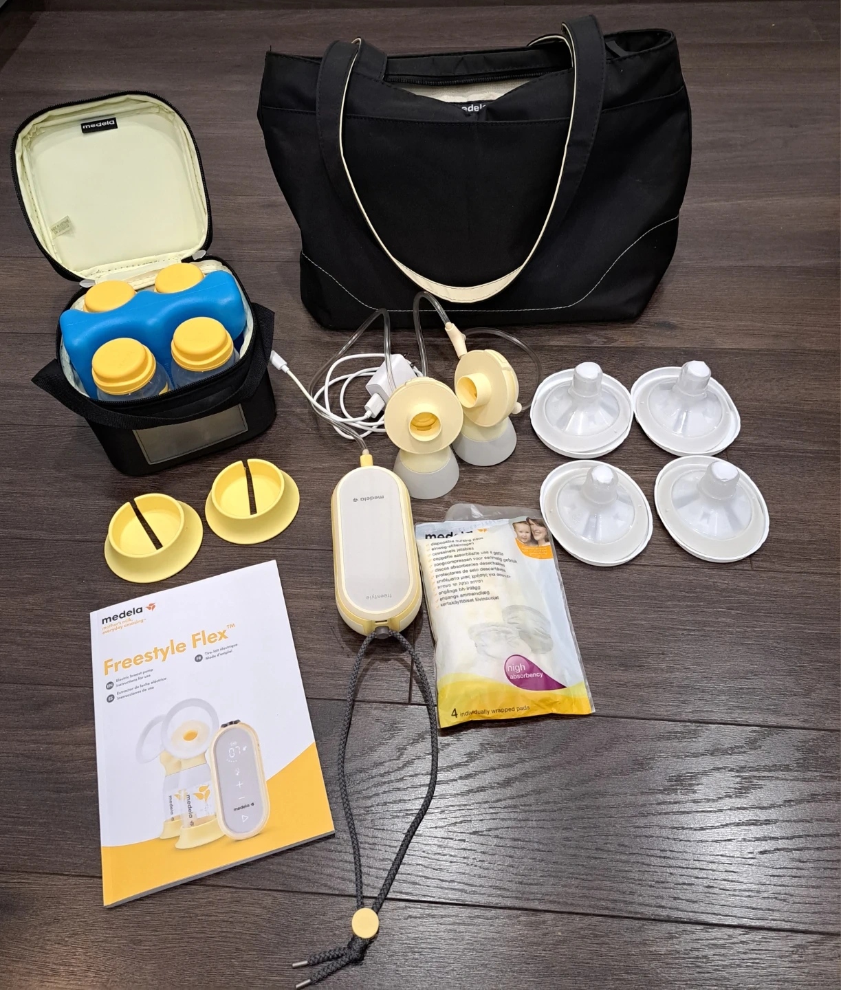 18Selling a Medela Freestyle Flex breast pump. It comes with all the accessories you see in the picture, including the bag, cooler, bottles x4, breast shields (21mm x2 and 24mm x2), and disposable nursing pads. Perfect for new moms!