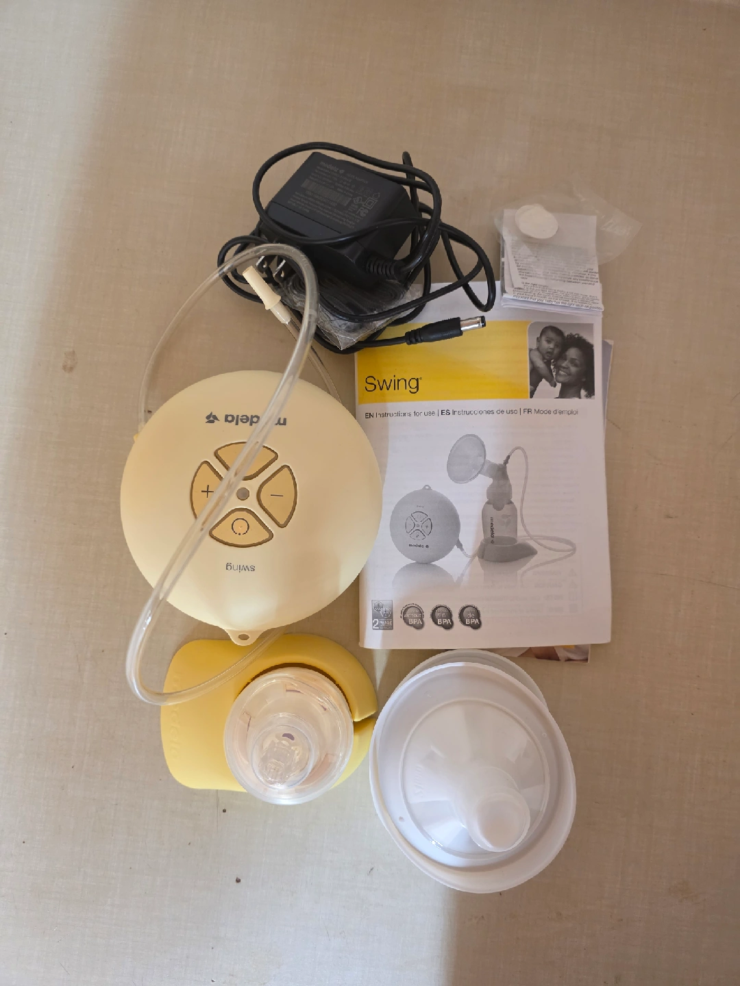 Selling a Medela Swing breast pump! with power adapter and instruction manual. should buy the pump set from Amazon, photo included. those are personal and can't be sold. used very few times, like brand new!! new cost 198+ tax , selling for 75!!