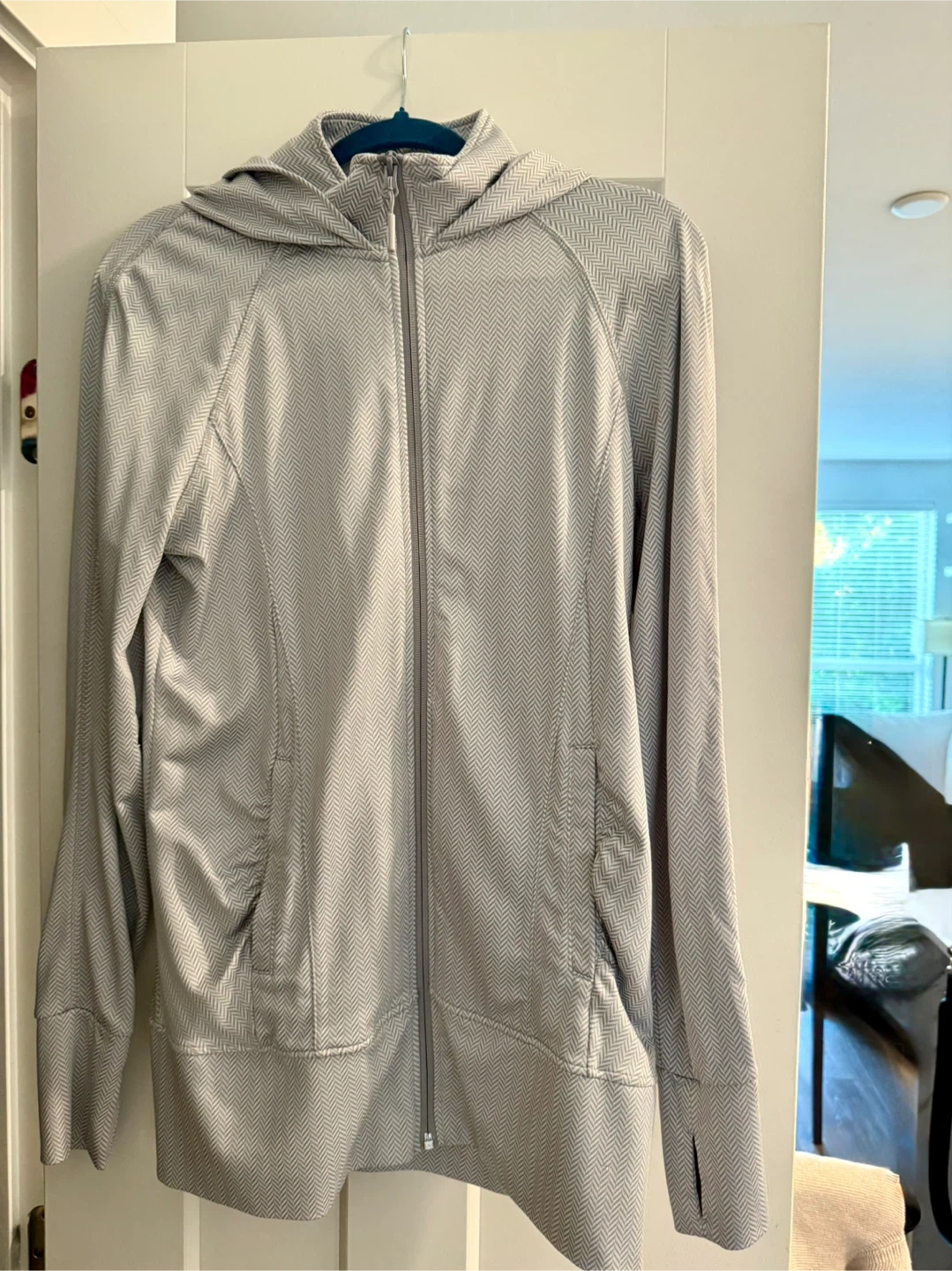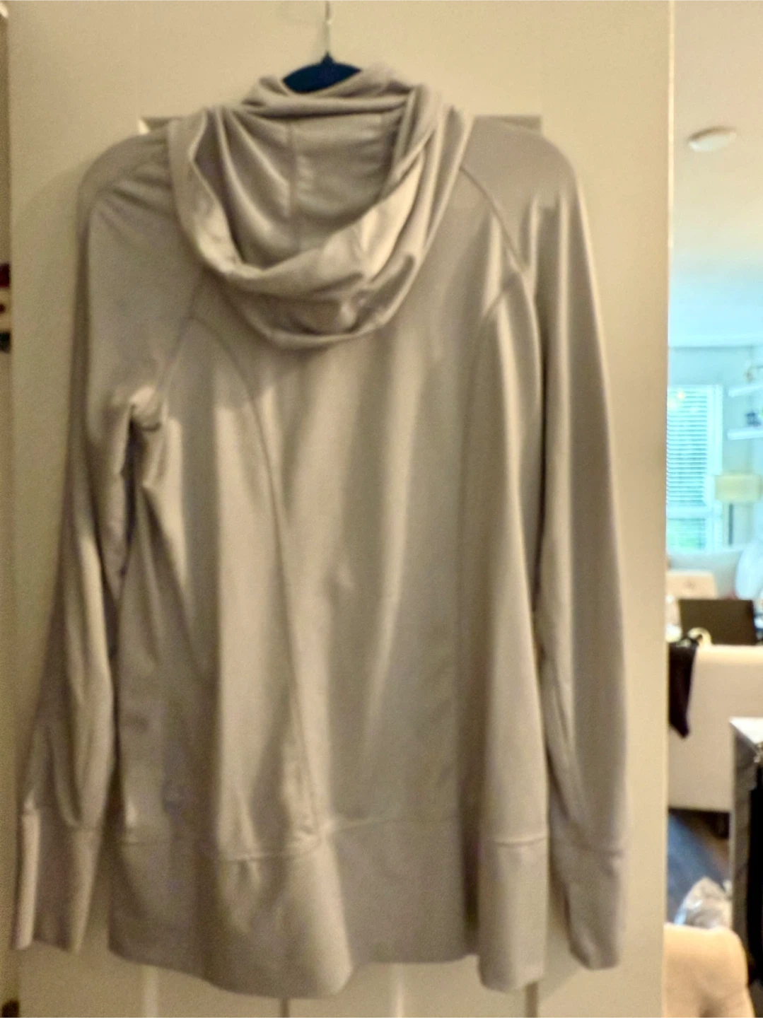10light grey hoodie in size L It's in great condition and perfect for layering or wearing on its own. The hoodie features a full zip closure and thumbholes for added comfort. It's made of a soft and stretchy material, making it ideal for workouts or everyday wear