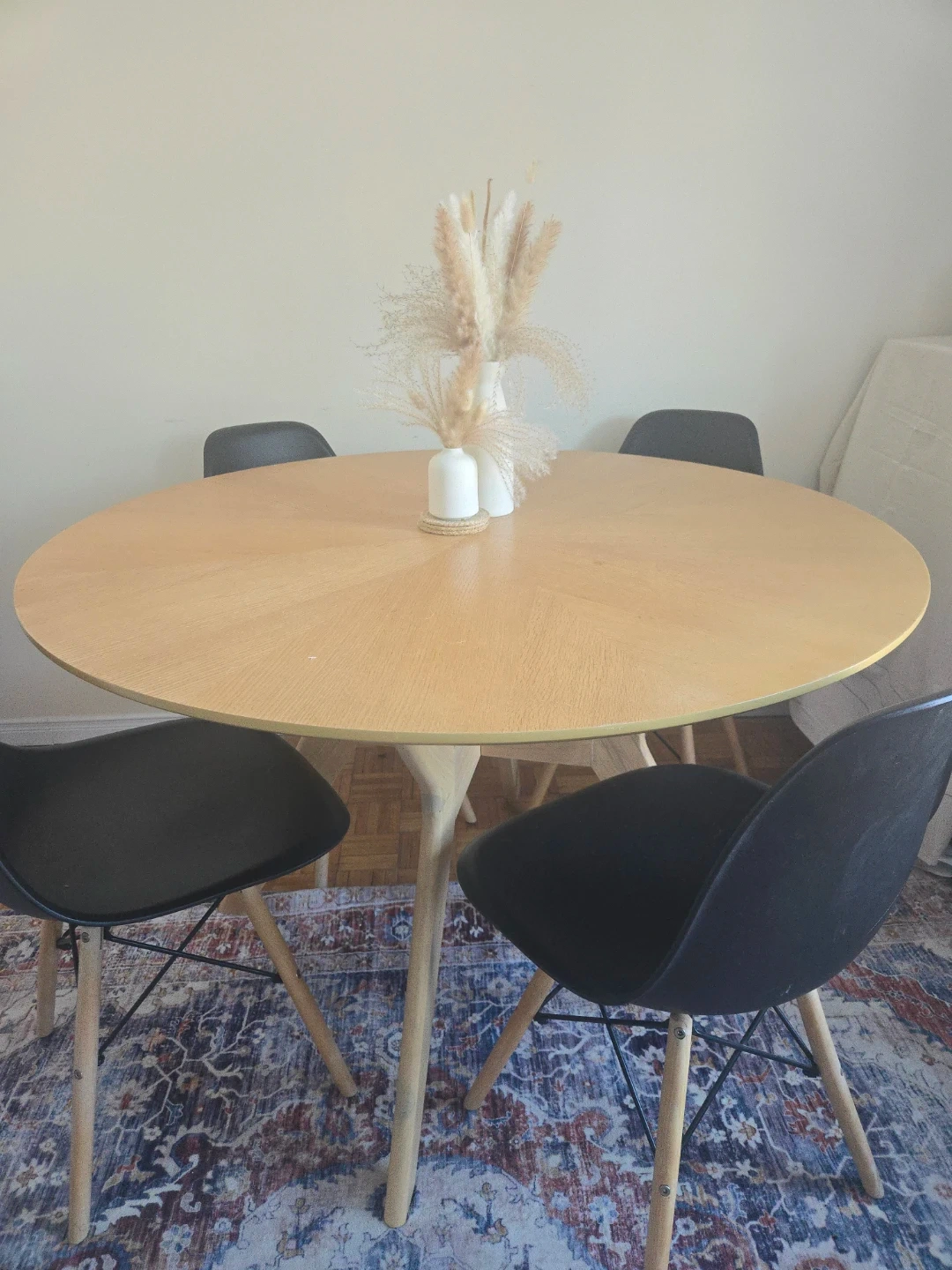 Round dining table with a light wood finish. Diameter is 46.7" and height is 29.9". Sturdy design with legs made of solid wood and a sunburst-patterned rubberwood veneer table top. Come with 4 chairs.