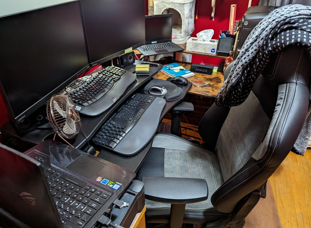 This sturdy desk converter is ready for a new home as my employer provided me with a new sit/stand electric desk. Don't miss the chance to grab this useful item. If the ad is up, it's available!
