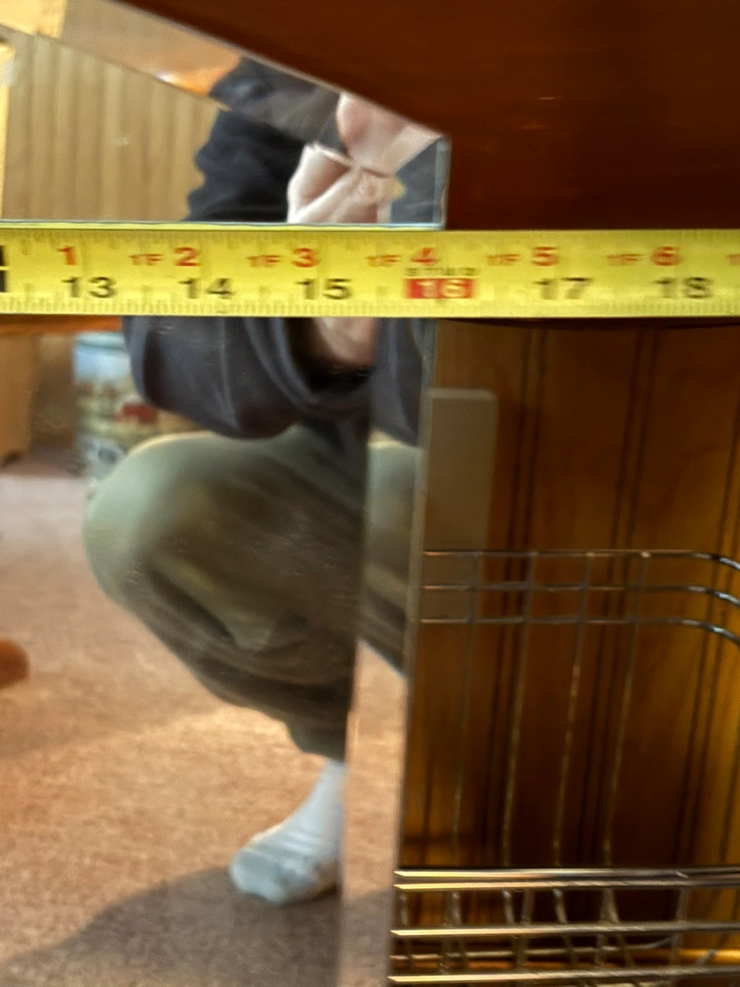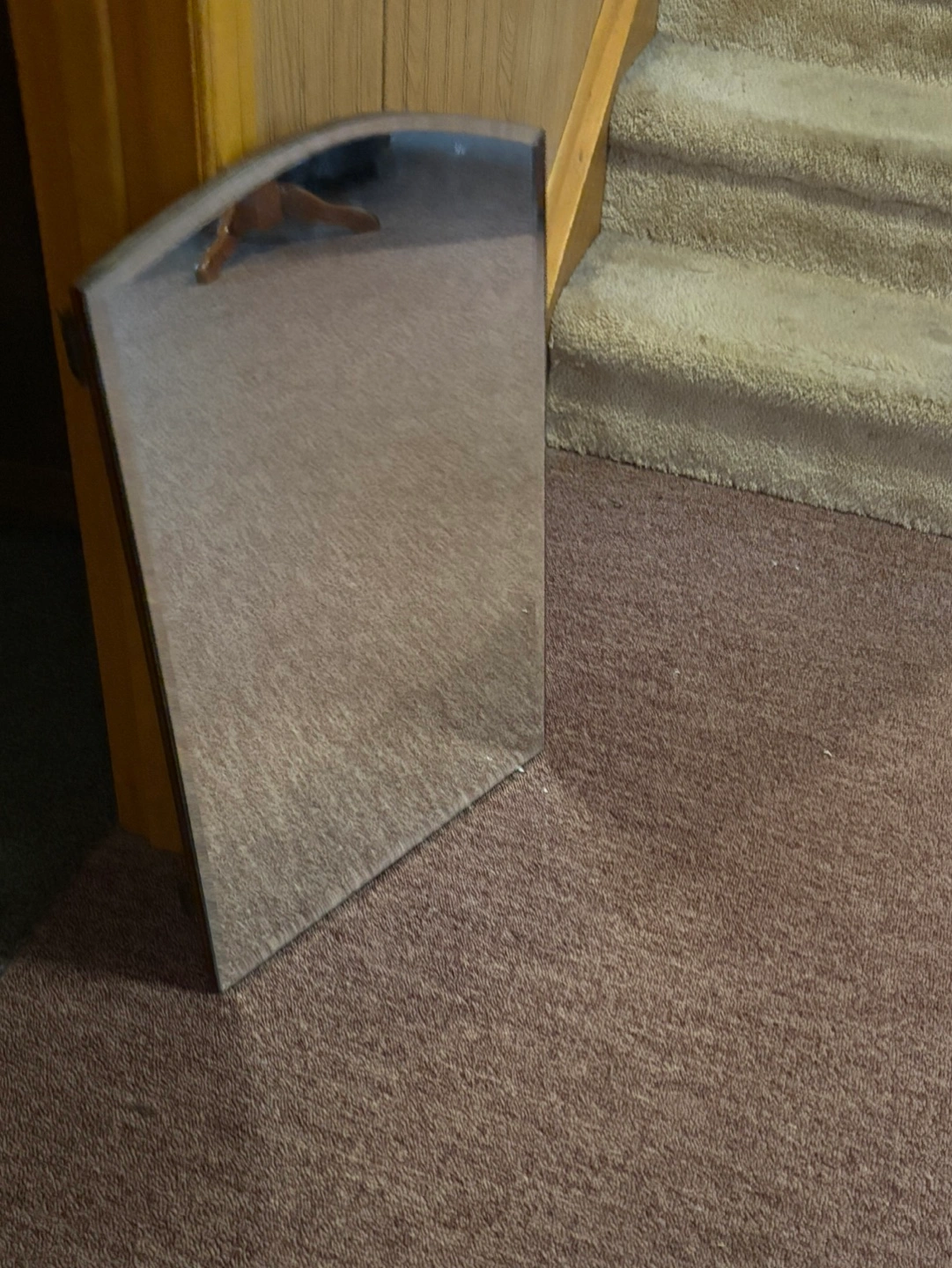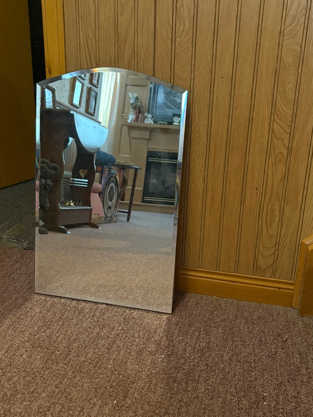 67Used medicine cabinet door and mirror. Arched top. Wood door, metal frame. Mirror measures approximately 15 inches wide. Cabinet door approximately 24 inches tall. Good condition.