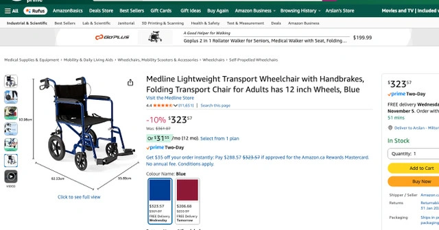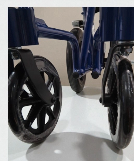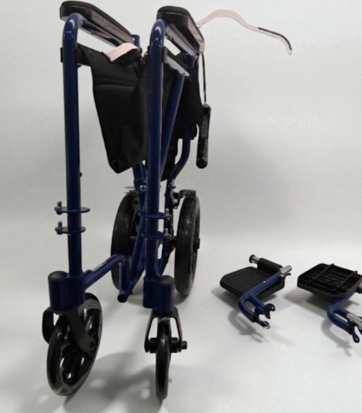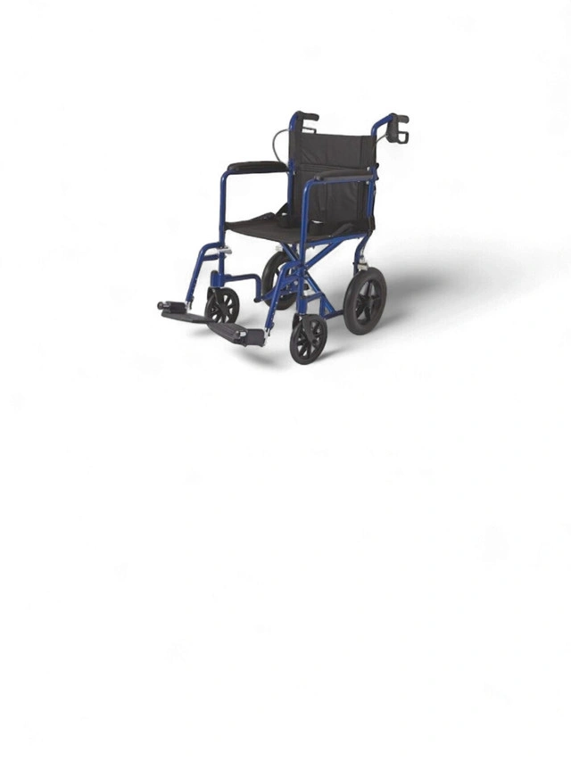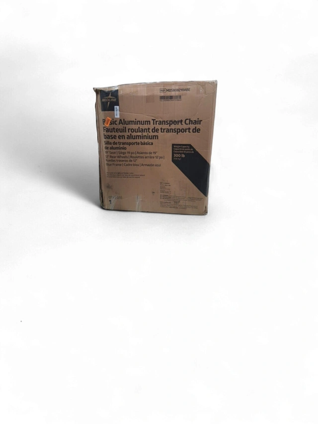 65Medline Aluminum Transport Chair WITH LARGE WHEELS AND BRAKES - 300LB MAX - 19" -BLUE (MODEL: MDS808210ABE) Brand New Item (OPEN BOX) LIGHTWEIGHT AND DURABLE: Lightweight, 26 lb., folding transport chair for adults has a sturdy aluminum frame; 300 lb. weight capacity ENHANCED SAFETY FEATURES: Easy-to-squeeze hand brakes and rear-wheel manual locking brakes allow for safe and secure transfers COMFORTABLE WITH EASY IN/OUT: Full-length cushioned armrests for comfort; spacious 19” wide x 16” deep seat; swing-away, detachable footrest make it easy to get in and out of the seat FOLDS EASILY FOR TRANSPORT: Compact design folds easily with swing-away footrest that lock in place for convenient storage and transport in car trunk; no assembly required with easy-clean nylon fabric GREATER MANEUVERABILITY WITH 12” REAR WHEELS: Large rear wheels coupled with swivel front wheels maneuver smoothly around tight corners, doorways or ramps; ideal for inside or outside