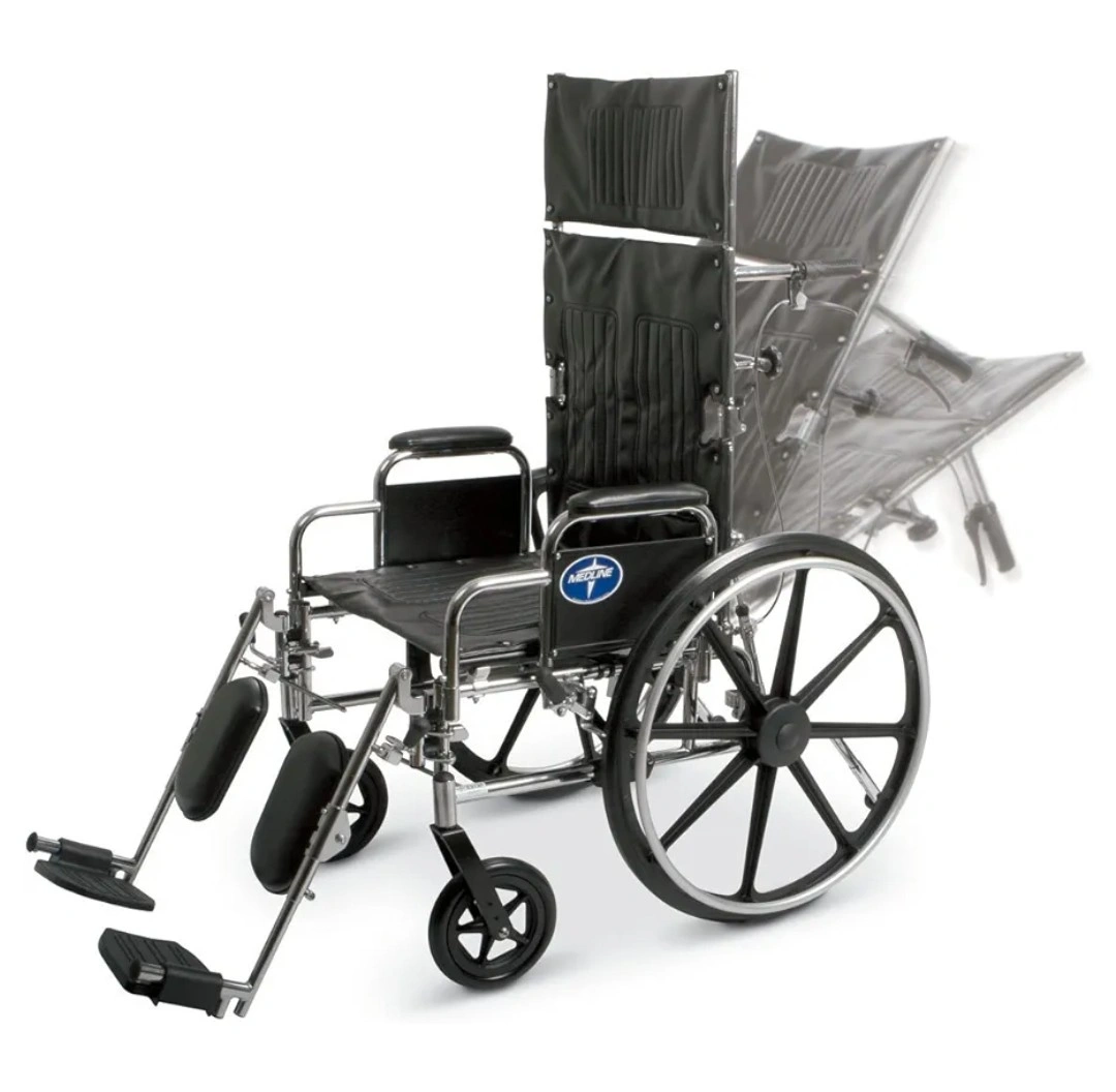 10Brand new Medline Excel Reclining Wheelchairs, 20-Inch. Infinitely adjustable recline from 90° to 140° with quick-adjust handles. Full back and head support is provided by 22" high back and 10" removable headrest. The durable vinyl upholstery is easy to clean, and the chrome-plated carbon steel frame is chip-resistant. Come standard with anti-tippers, removable desk-length arms and swing-away elevating leg rests.