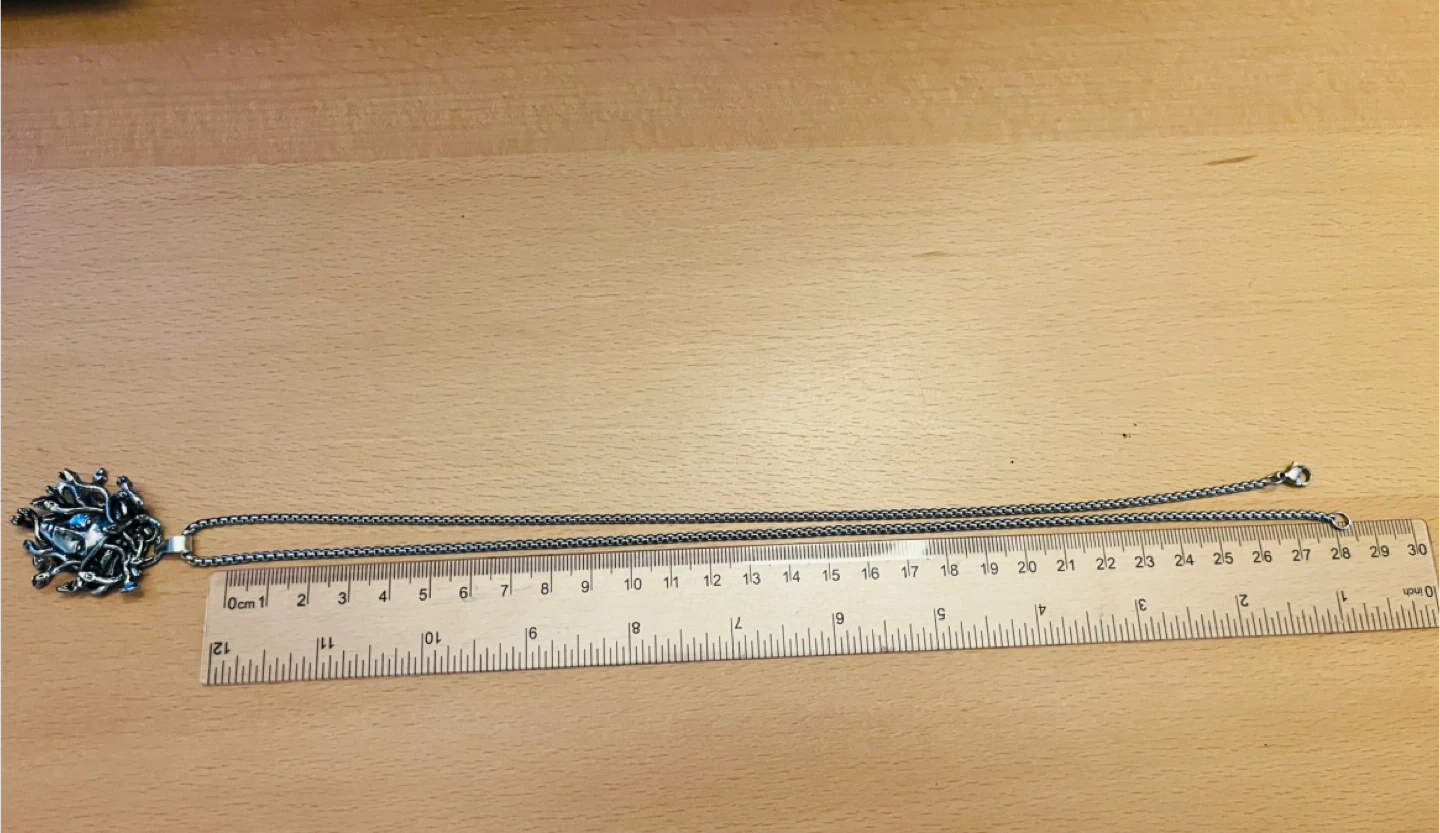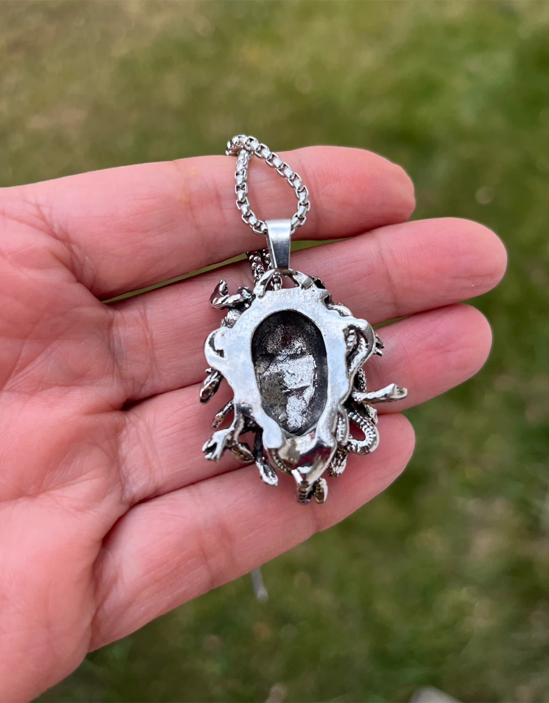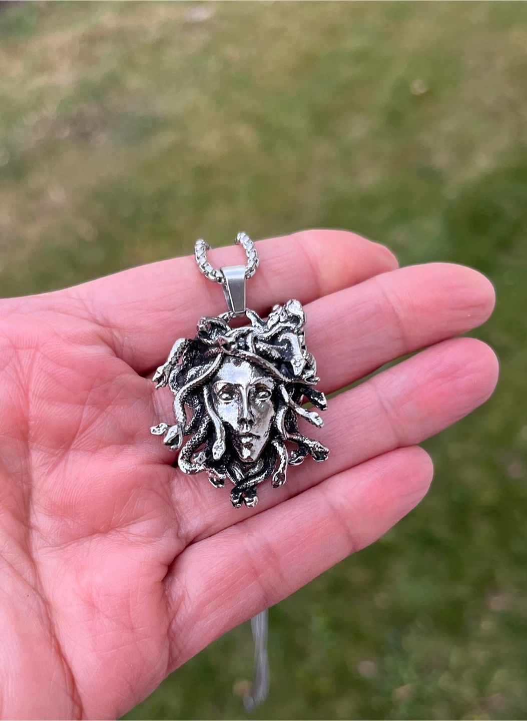 125Check out this unique Medusa pendant necklace! It features a detailed Medusa head surrounded by snakes, all in a silver-tone finish. The chain measures approximately 28cm. Serious inquiries only