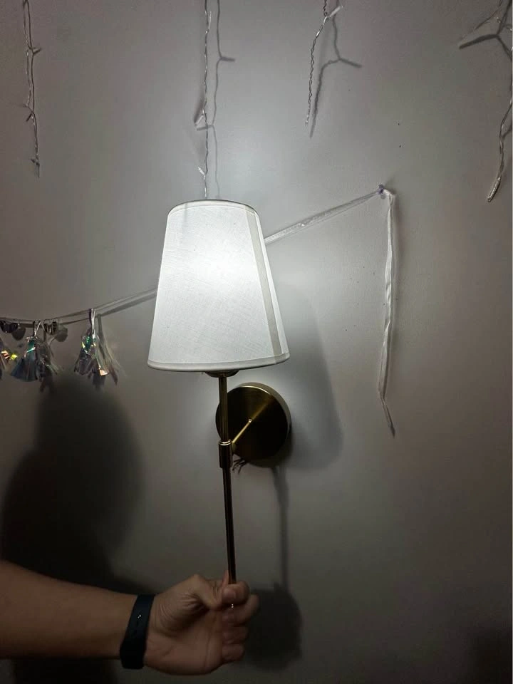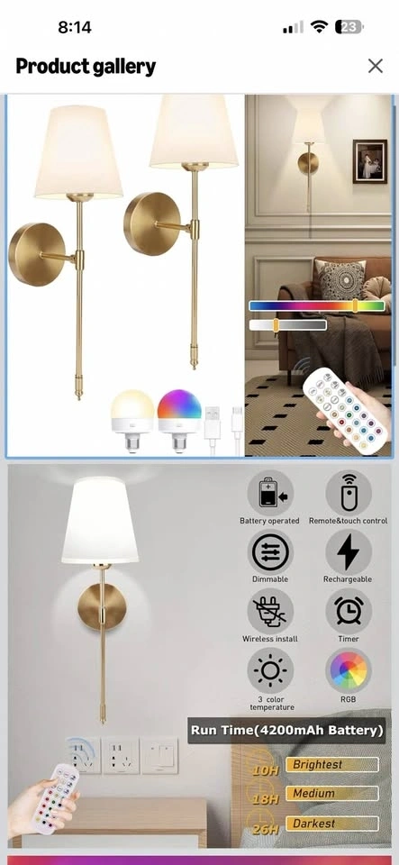 Transform any room with this stylish, rechargeable wall lamp. Perfect for living rooms, bedrooms, hallways, or rental spaces. The elegant gold finish and fabric lampshade bring a modern luxury vibe to your home. It's completely wireless, no electrician needed! Features 13 RGB colors plus warm and dynamic lighting modes, dimmable brightness for perfect ambiance, and a remote control to easily change settings. Easy to mount on the wall in minutes. Great for bedroom or living room decor, apartment rentals (no drilling required), or as night or mood lighting.