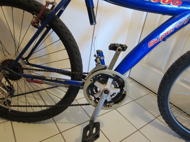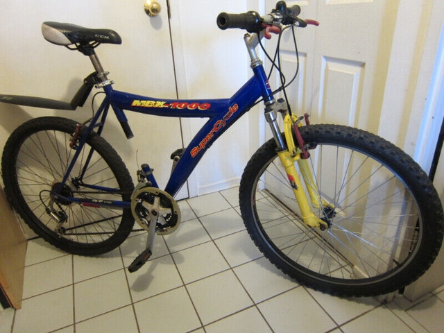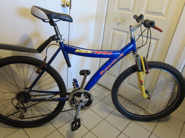 For sale is a Supercycle MBX-1000 all-terrain commuter bicycle with a 20" (50 cm) frame, suitable for riders 5'2"-5'10". It features good quality 26" black anodized rims with wide tires, 18-speed grip-twist shifters, strong V-brakes, and a comfortable seat. The bike is priced at $120 and includes a free helmet and kickstand. A rear fender and bell are available for an additional $20. The frame has some scratches, but overall, this bike is in good condition and ready to ride. For Sale By: Owner. Frame Size: M.