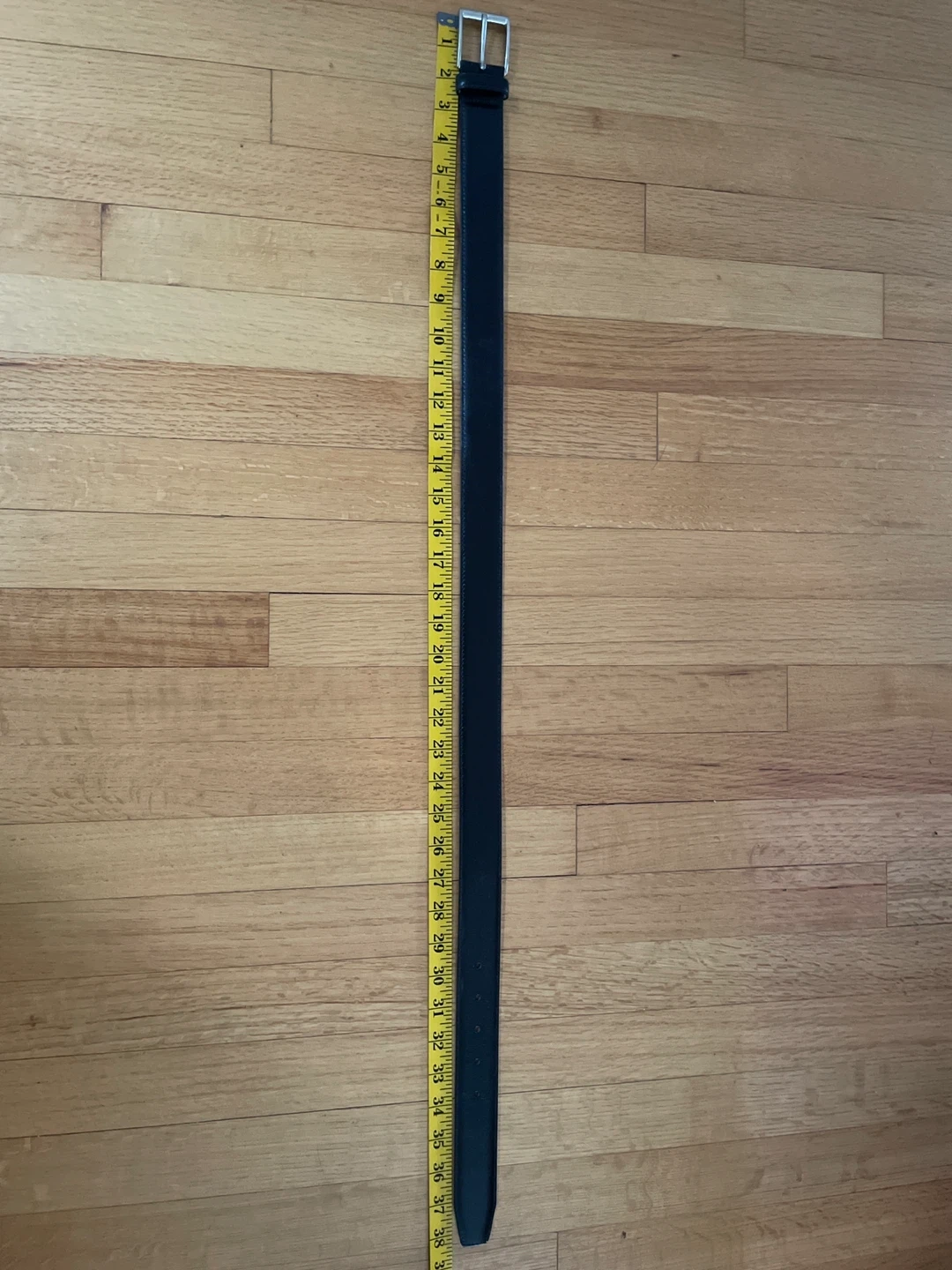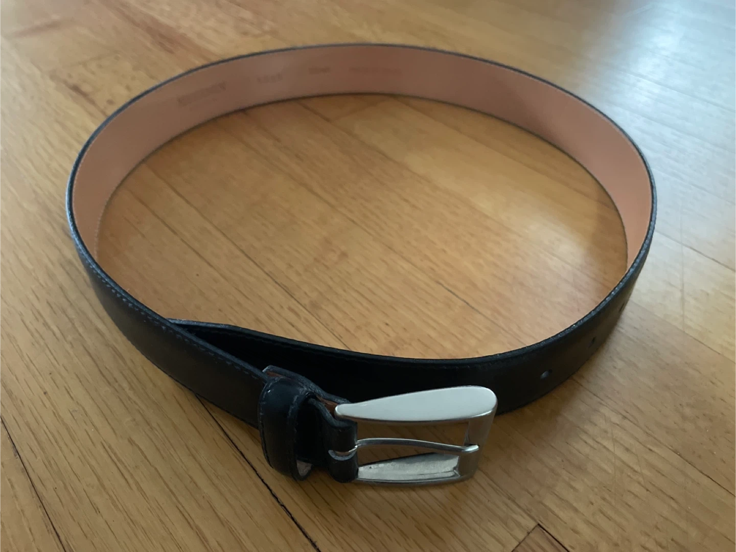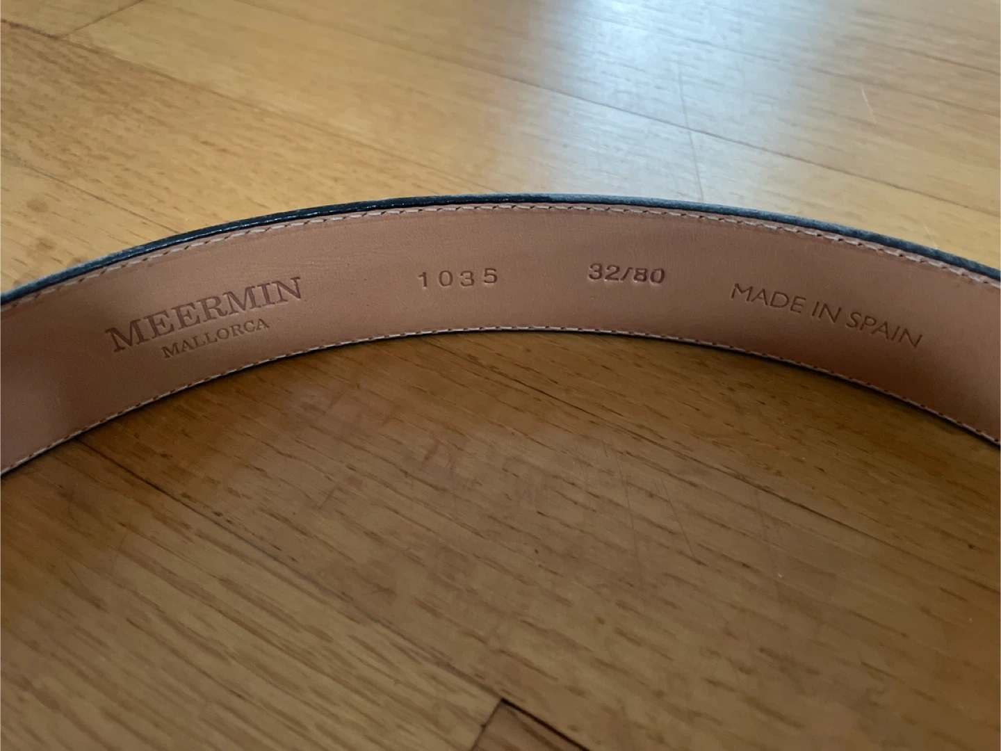 15Selling a Meermin Mallorca leather belt in size 32. It's a stylish belt made in Spain with black boxcalf leather and vegetable tanned leather. The belt measures approximately 38 inches in total length. -Nickel plated brass buckle -35mm width -new/never worn