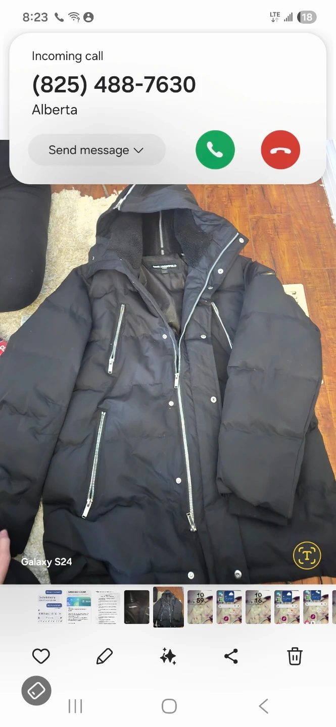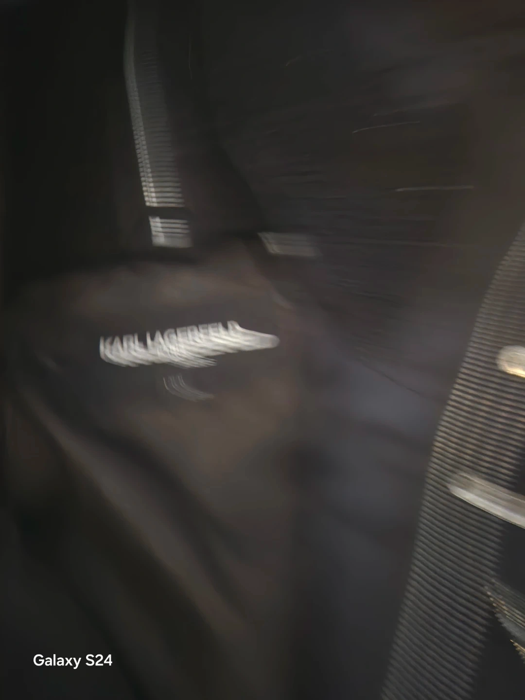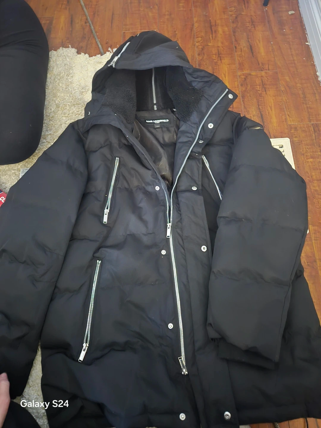Black Karl Lagerfeld puffer coat with a full zip closure and a hood. It has zipper details on the pockets and down the sides. This coat is designed for warmth and style.