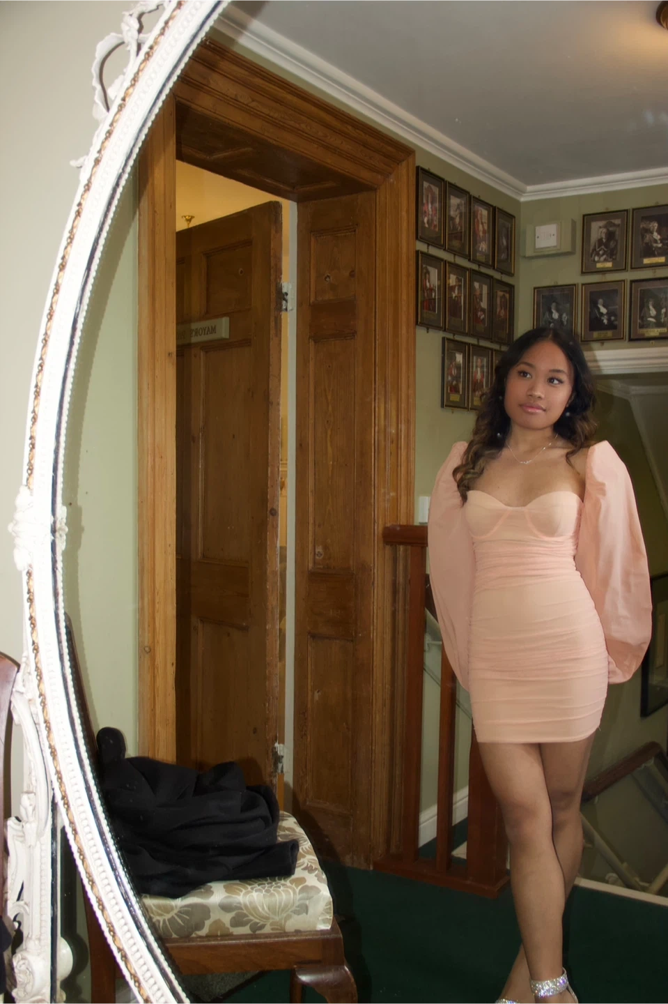 Long Puff Sleeve Ruched Mesh Mini Dress