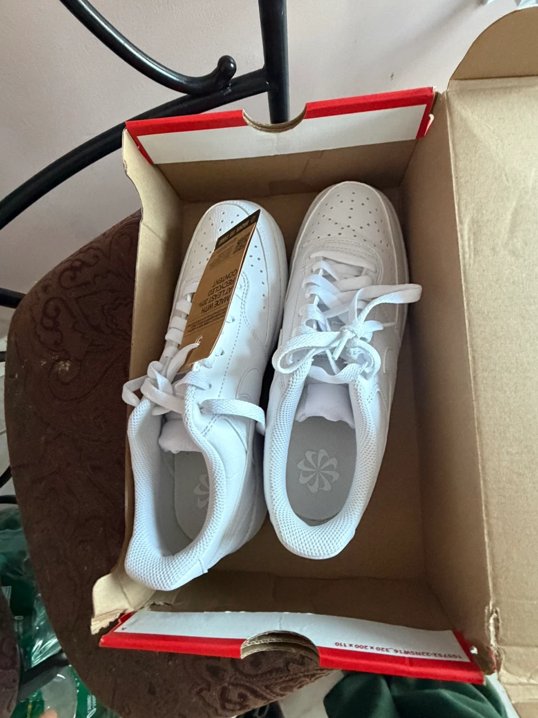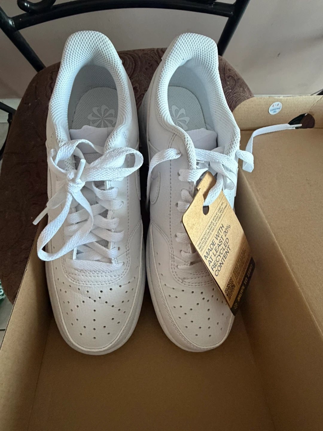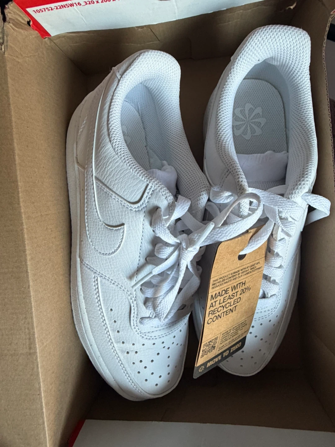 These white leather Nike Air Force 1 sneakers are a classic choice. They're made with at least 20% recycled content. These are great for everyday wear and a versatile addition to any wardrobe!