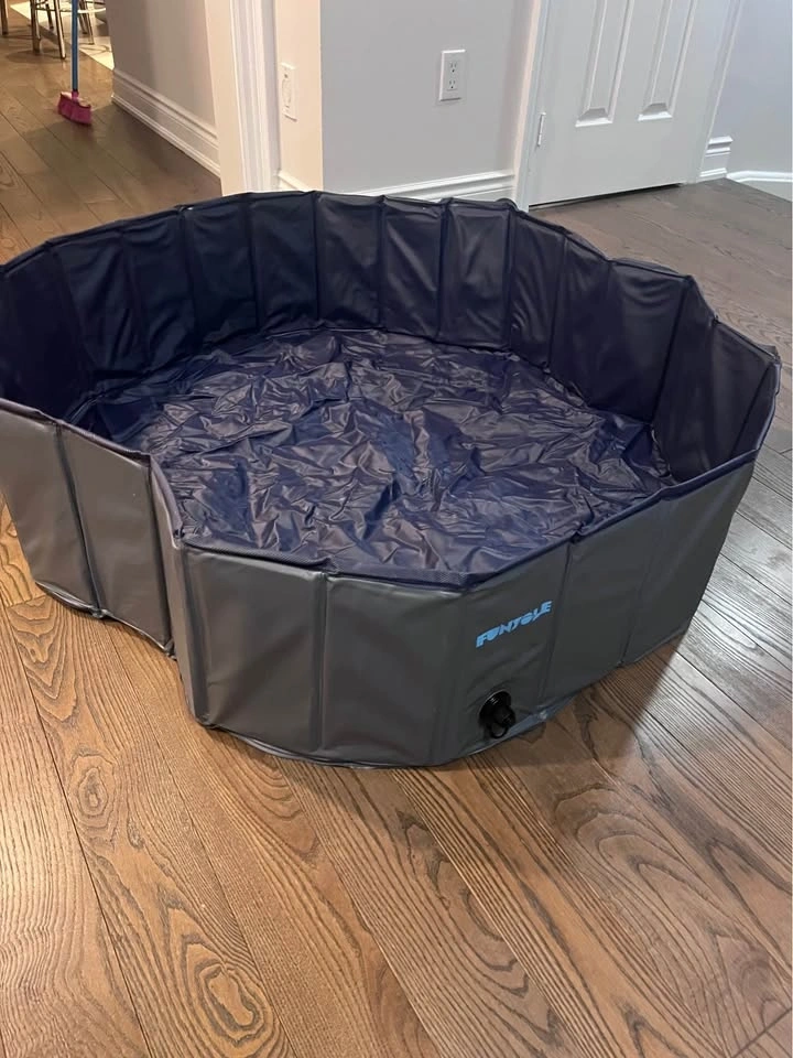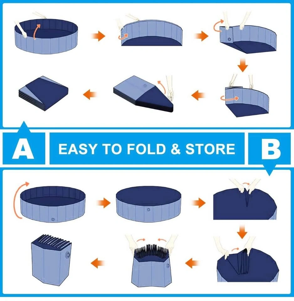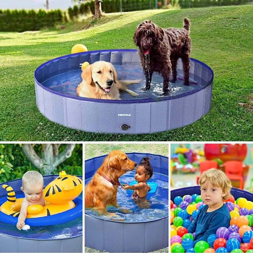Durable & Safe: Dog pool is made of extra-tough and anti-scratch PVC material, 0.55cm high-strength compression fiberboard, not easy to collapse and get scratched by dogs. And the unique non-slip bottom design makes your pets and kids safer while bathing or playing. Portable and Foldable: Pet swimming pool 48 inches across.