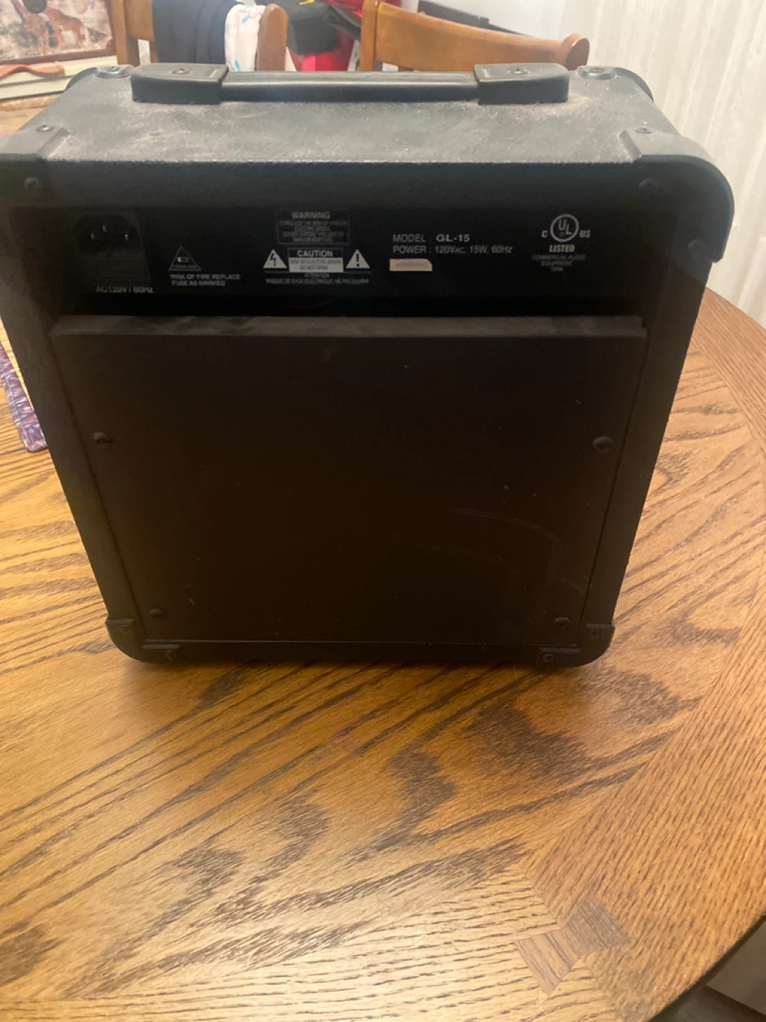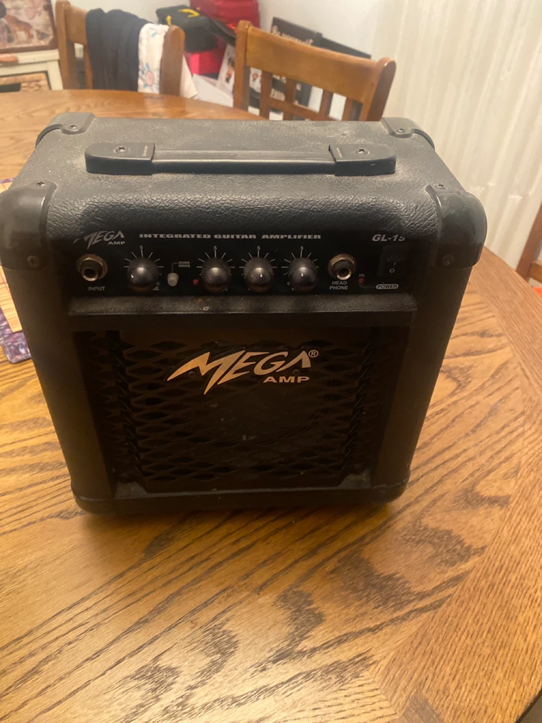 31Selling a Mega Amp GL-15 integrated guitar amplifier. It's a compact and portable amp, perfect for practice or small gigs. It has an input jack, headphone jack, and power switch on the front. The back panel shows it's a 15W, 60Hz amp. I couldn’t find the power cord
