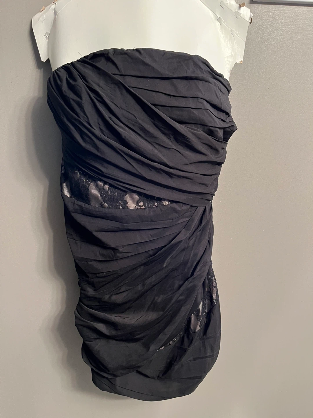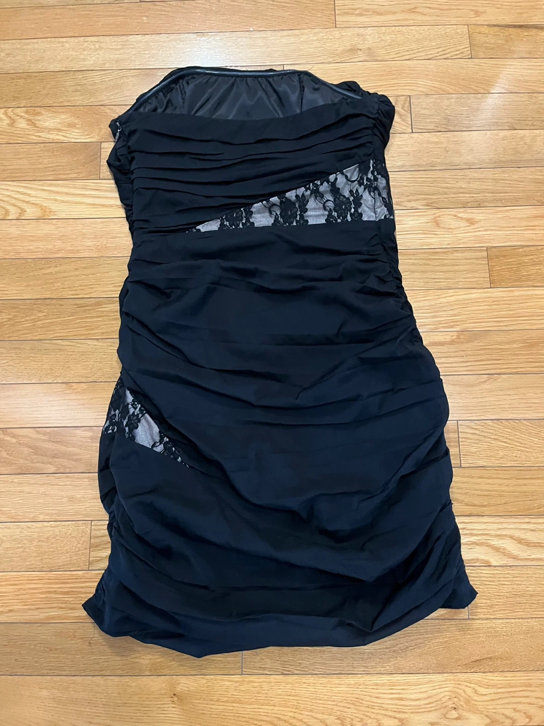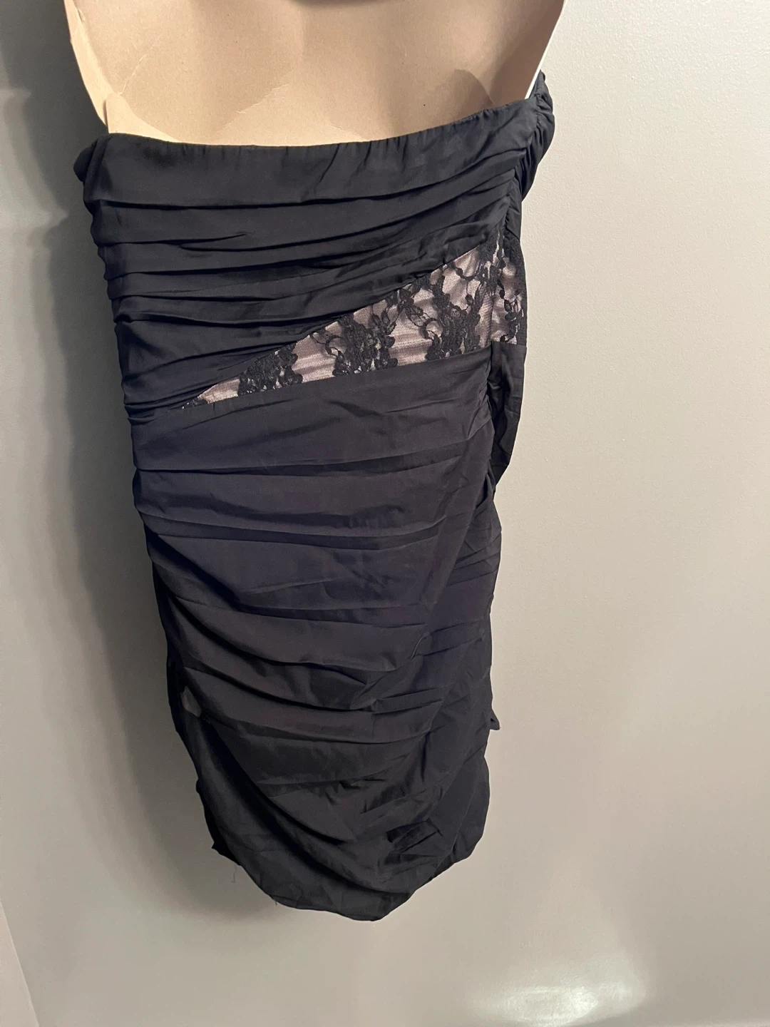 Black strapless, rouched & pleated dress with lace inserts. Side zipper & hook. Slight stretch