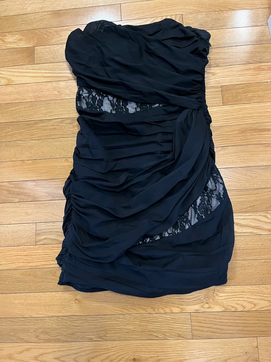 Black strapless, rouched & pleated dress with lace inserts. Side zipper & hook. Slight stretch