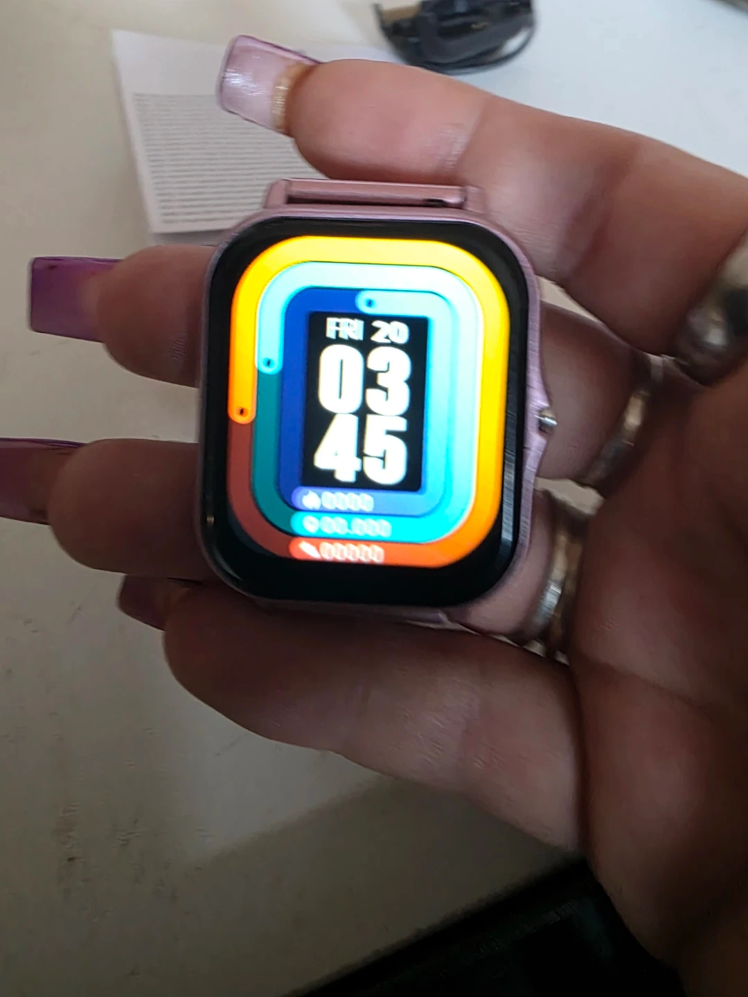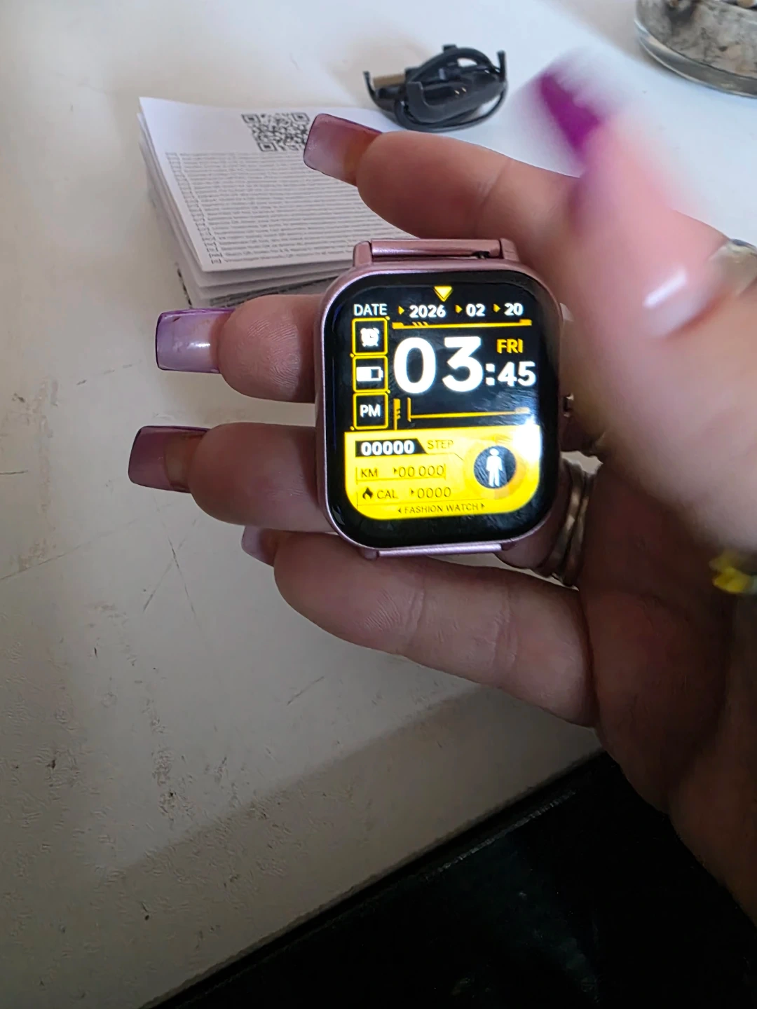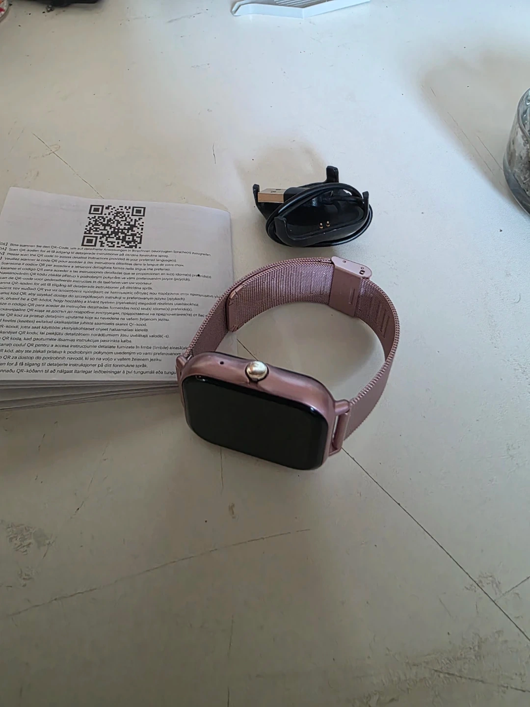 Smart watch in a rose gold colour. It comes with a charging cable. The watch displays time, date, steps, distance, and calories. It also has various app icons visible.