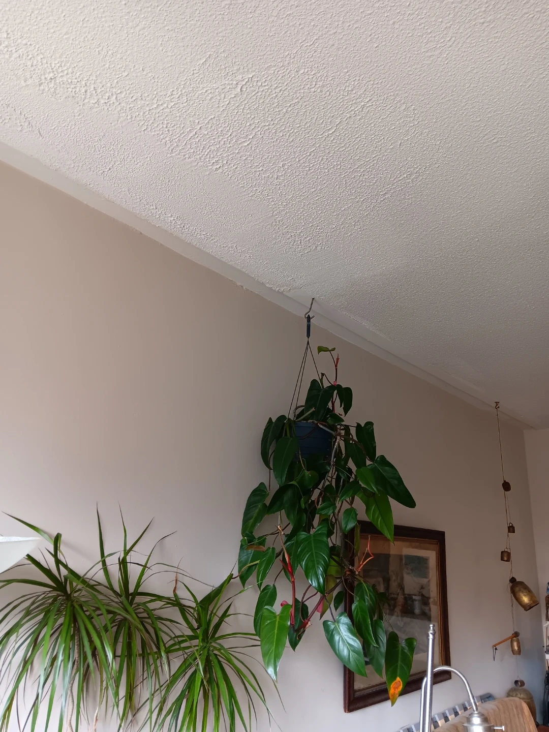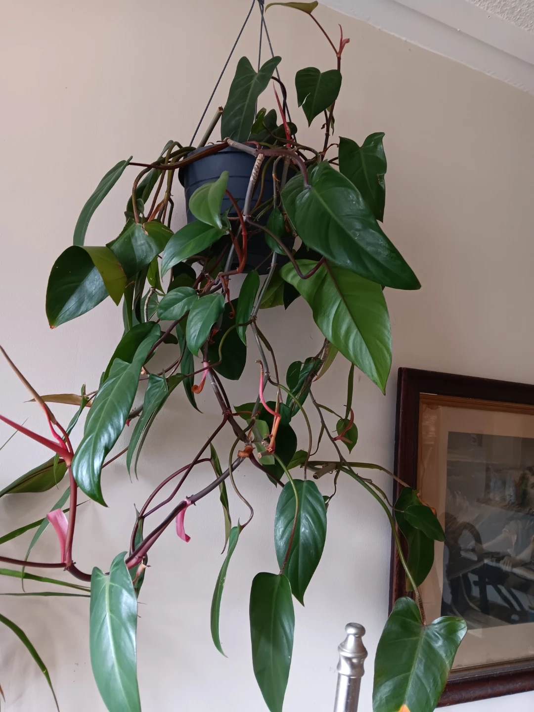 This lush heartleaf philodendron is in a dark blue hanging pot. It's got glossy green leaves and striking reddish stems. The plant trails beautifully, adding greenery to any space.