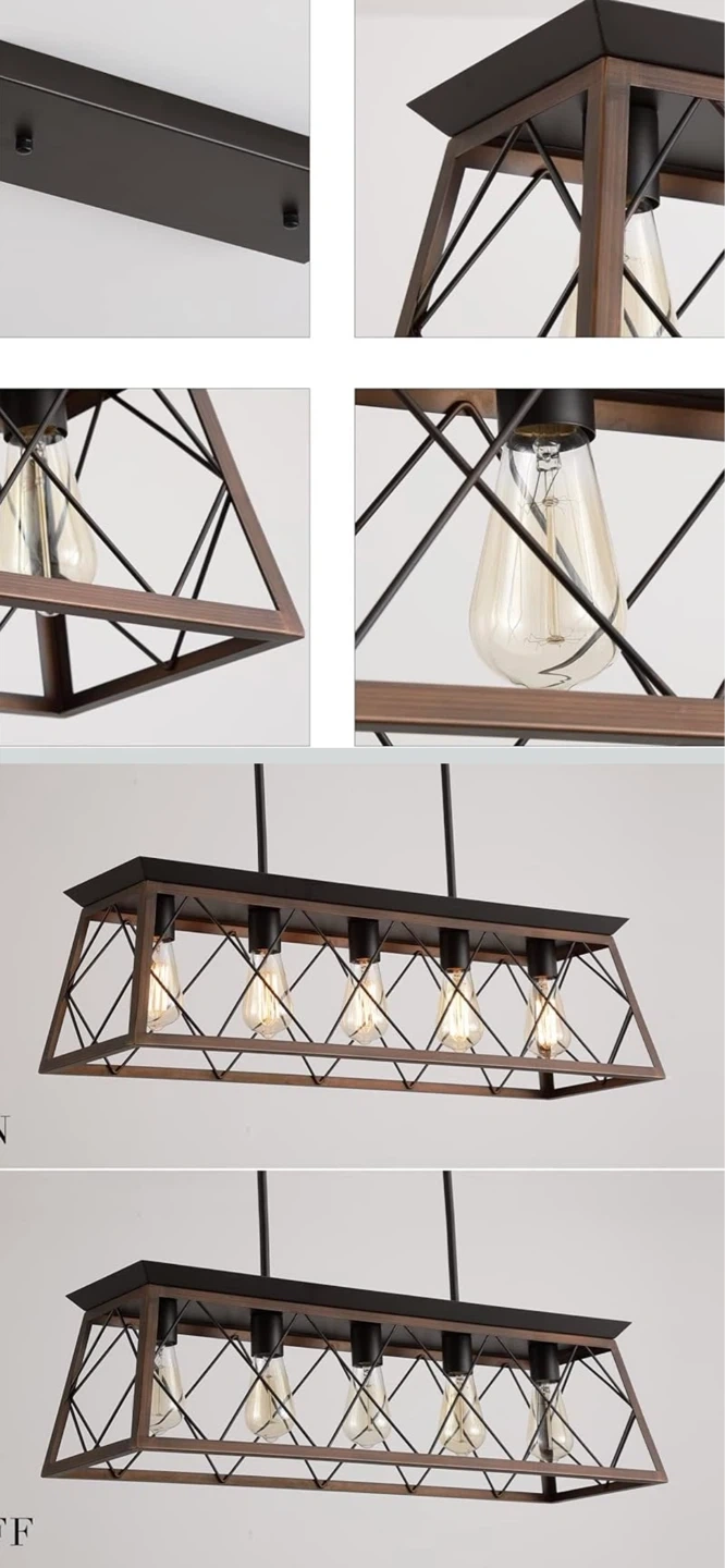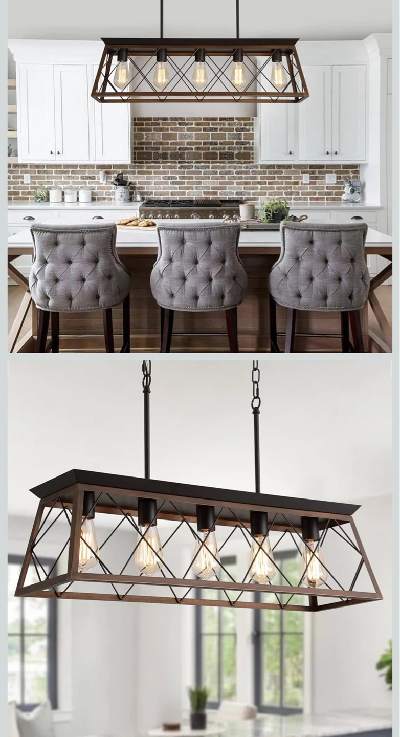 This farmhouse-style chandelier features a black metal frame with a rustic wood finish. It has five lights and a rectangular cage design. The fixture measures 31.5 inches wide and 8.66 inches in height, with an adjustable hanging length. It's perfect for dining rooms or kitchen islands!