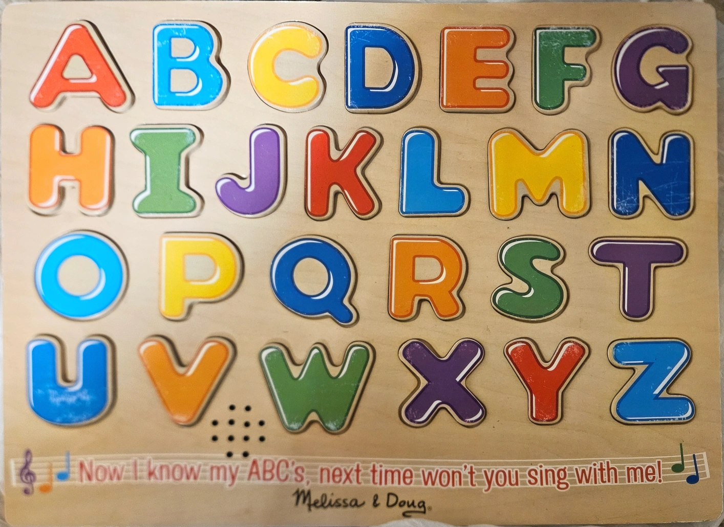 64both for $25. Melissa & Doug Alphabet sound puzzle measuring 0.8" x 10" x 13.5" pronounces the correct name of each letter when it is placed correctly. Puzzle helps to reinforce the relationship between letters and their sounds. Age group and grade: Ages 2 - 14 years and grades toddler - 9th Theme/design: Alphabet Size: 0.8" x 10" x 13.5" Material: Wood Number of pieces: 26 Pronounces the correct name of each letter when it is placed correctly Removable puzzle piece Helps to reinforce the relationship between letters and their sounds Slightly raised above the puzzle board for easy grasping