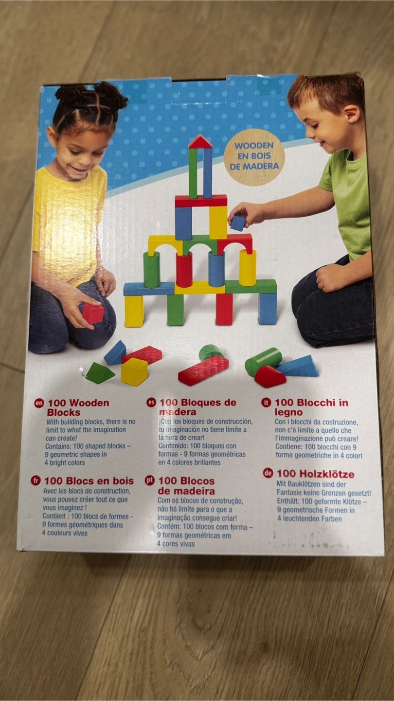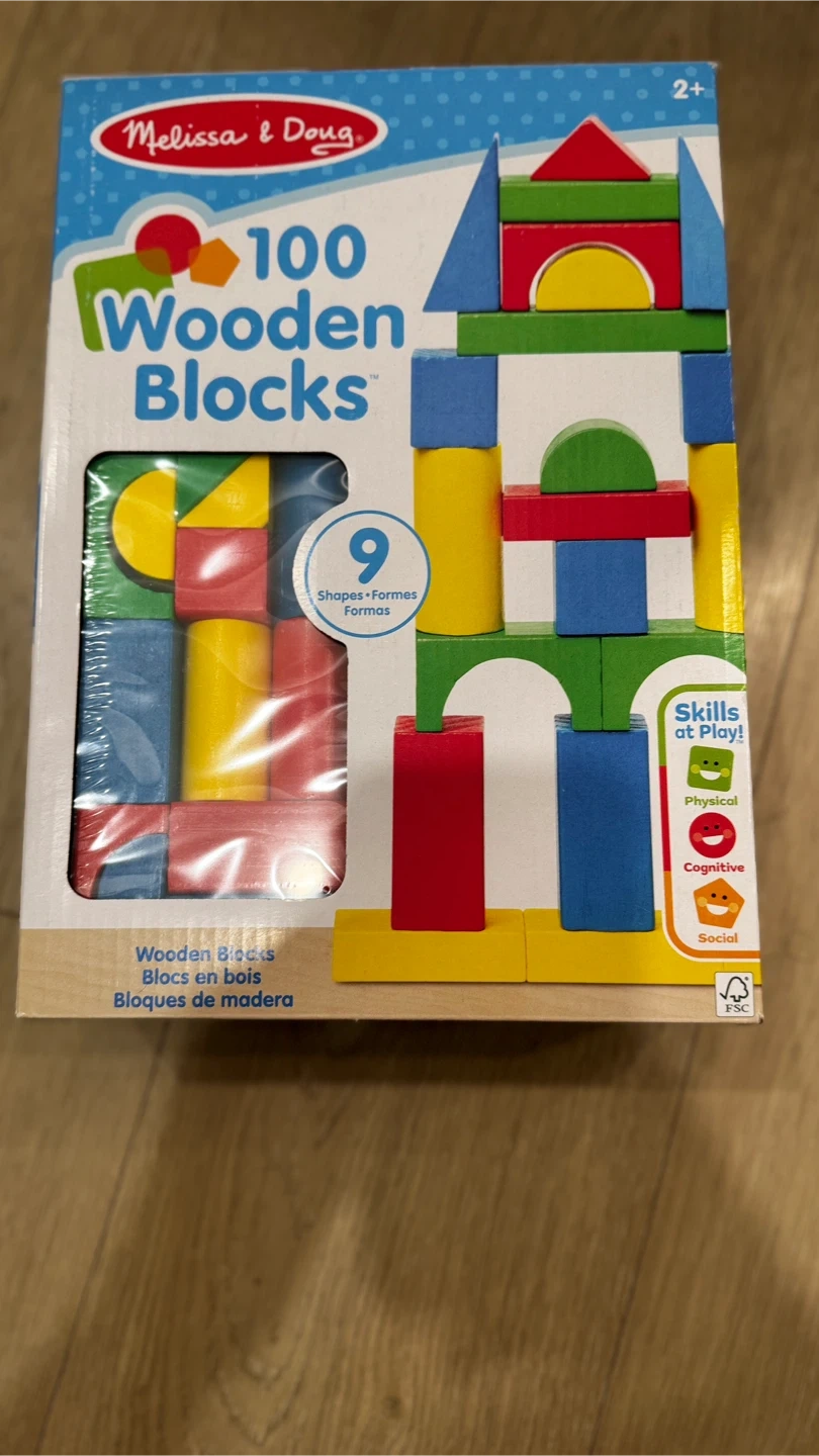 Selling a Melissa & Doug 100 Wooden Blocks set! It's in like-new condition and comes with the original box. Great for kids 2+ for developing physical, cognitive, and social skills. Includes 100 shaped blocks in 9 bright colours Retail 40cad sealed pack