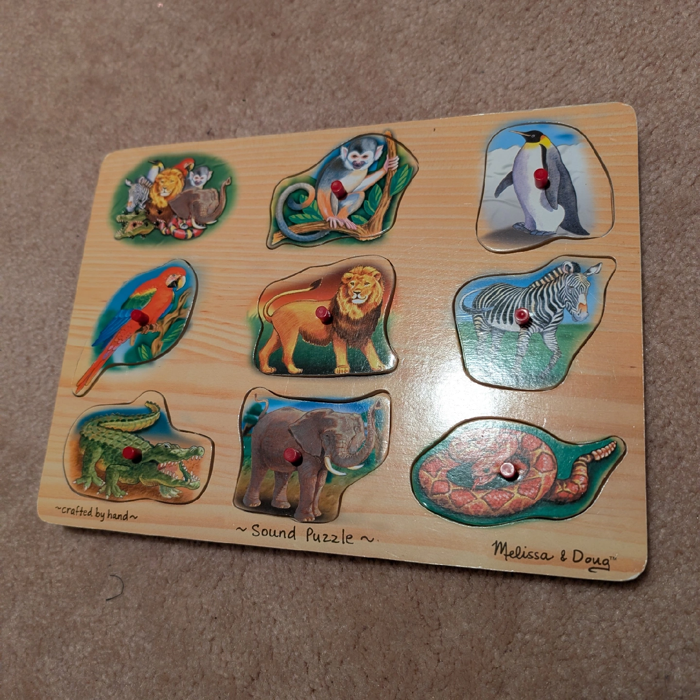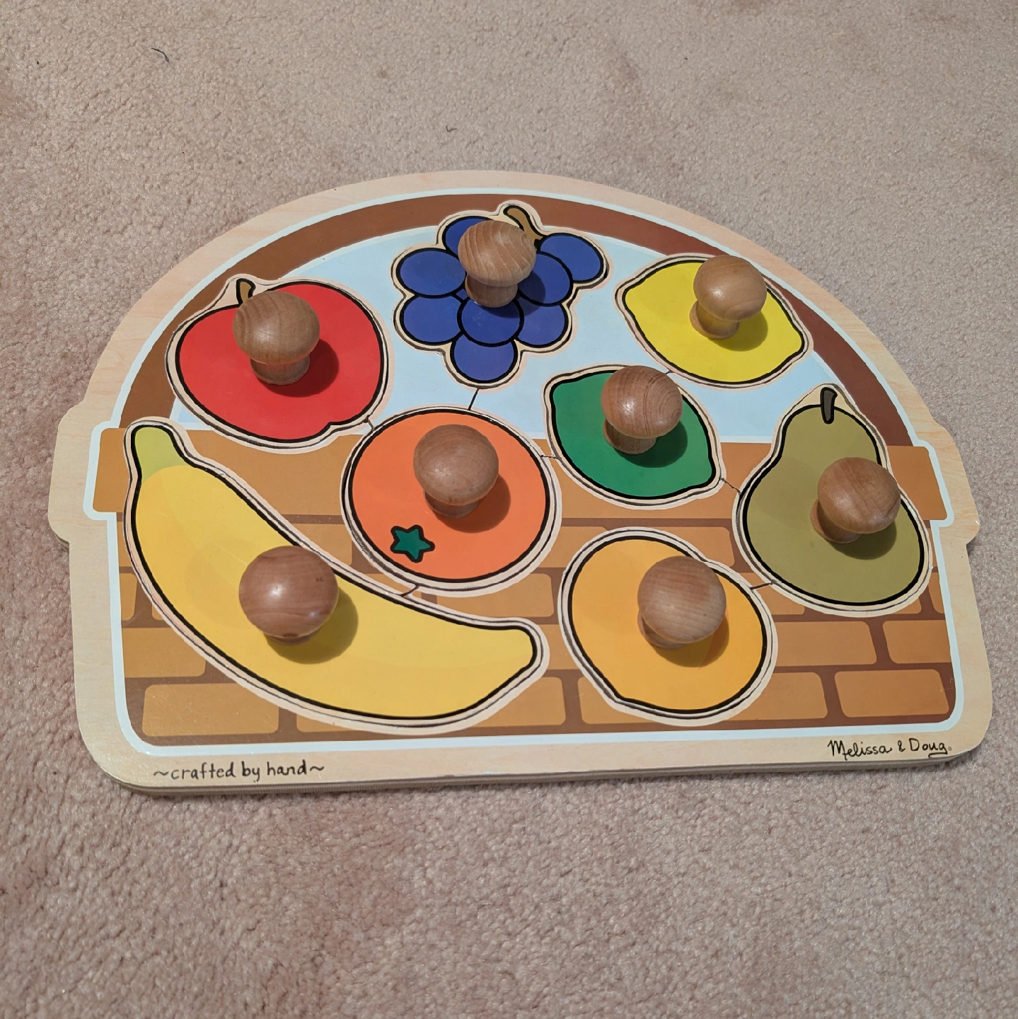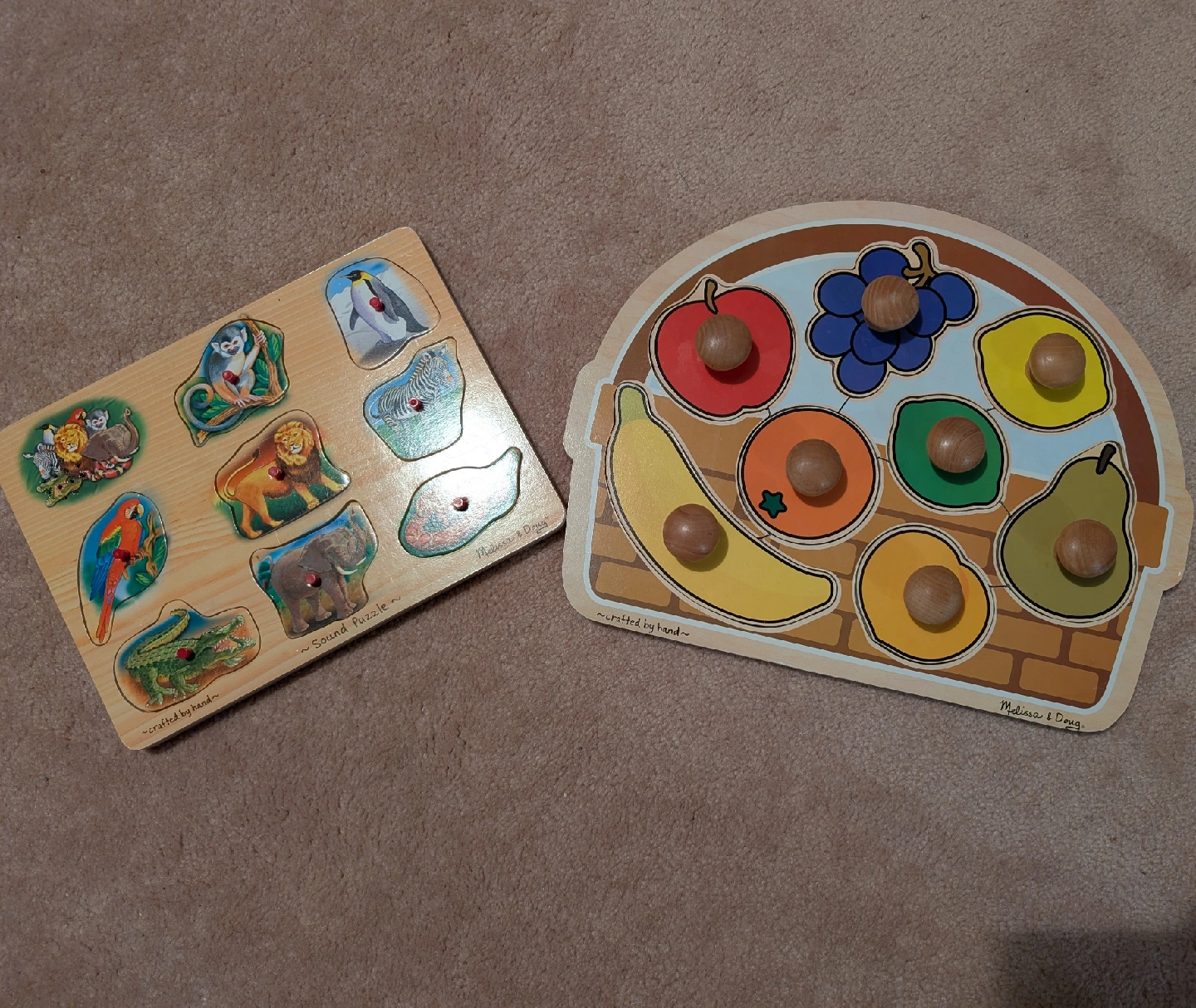 Two Melissa & Doug puzzles for sale! One is a Zoo Sound Peg Puzzle and the other is a Fruit Basket Jumbo Knob Puzzle. The Zoo puzzle features 8 realistic zoo sounds and is recommended for ages 2 and up. All the sounds still work! The Fruit Basket puzzle has sturdy wood construction and easy grasp knobs, perfect for little hands. It's designed with pictures under the pieces for added fun. Recommended for ages 1+. These wood puzzles are hand crafted and excellent quality. Full disclosure: This item was donated to my community center as part of a fundraiser. All the funds raised will be donated to the Armenian Community Centre!