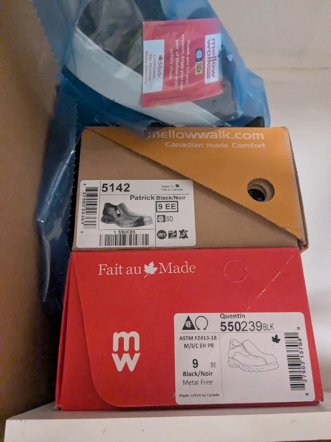 10Selling a pair of Mellow Walk safety shoes. One pair is the Patrick style in size 9 EE, and the other is the Quentin style in size 9 3E. Both are black/noir and metal-free. Made in Canada for comfort and safety!