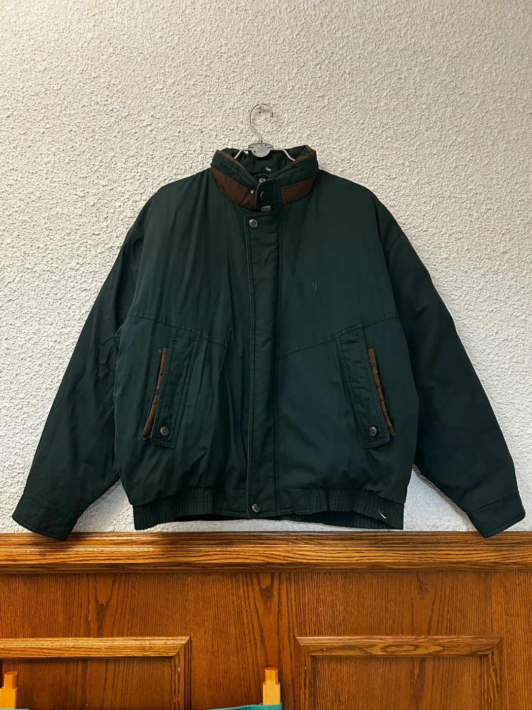 65Selling a Members Only Traditions down jacket in size medium. It's a stylish and warm jacket, perfect for the colder months. It features a green and brown colour scheme. There is a small tear on one of the pockets.