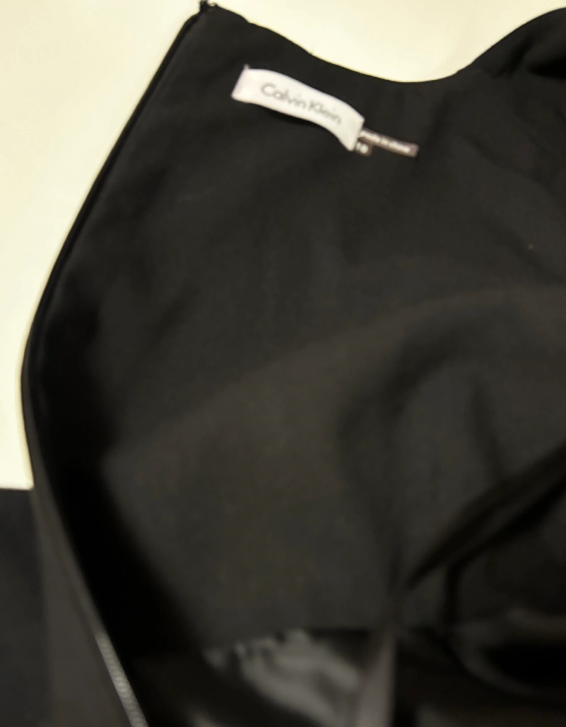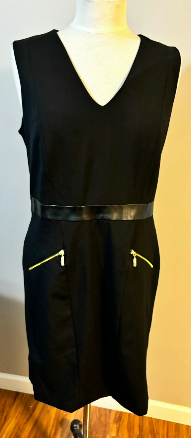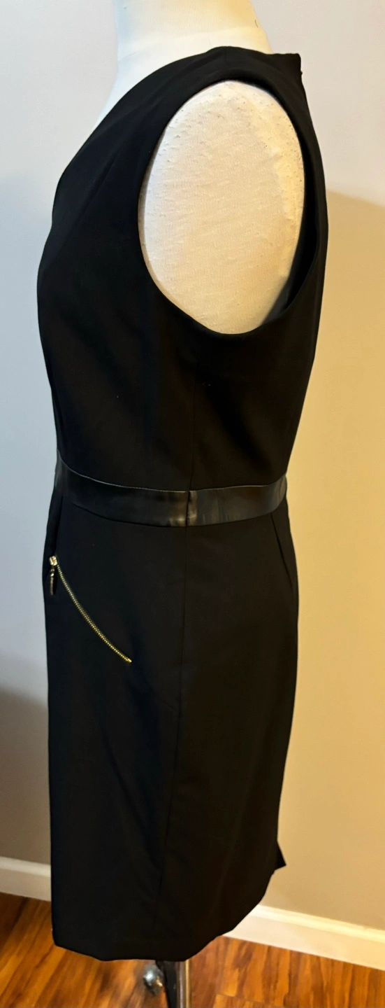 Classic black sheath dress. Sleeveless with V-neck. Features a waist band and gold zipper accents. Dry clean only.