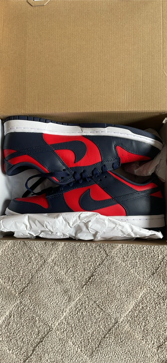 55Nike Dunk Low Retro sneakers in gym red and midnight navy size 8.5 mens. These shoes are in great condition never worn. Perfect for adding a pop of colour to your wardrobe and make a great gift for this holiday season!