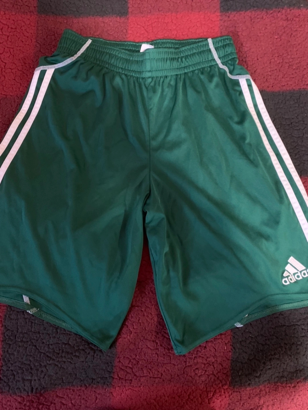 16Green athletic shorts. Features white side stripes and Elastic waistband. Size small.