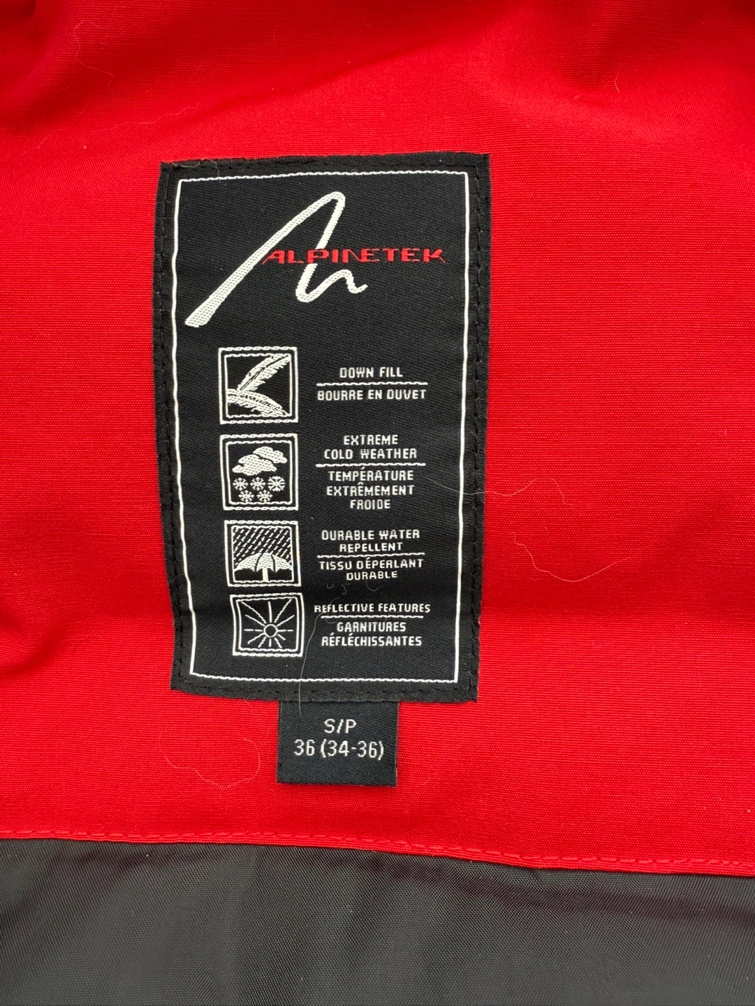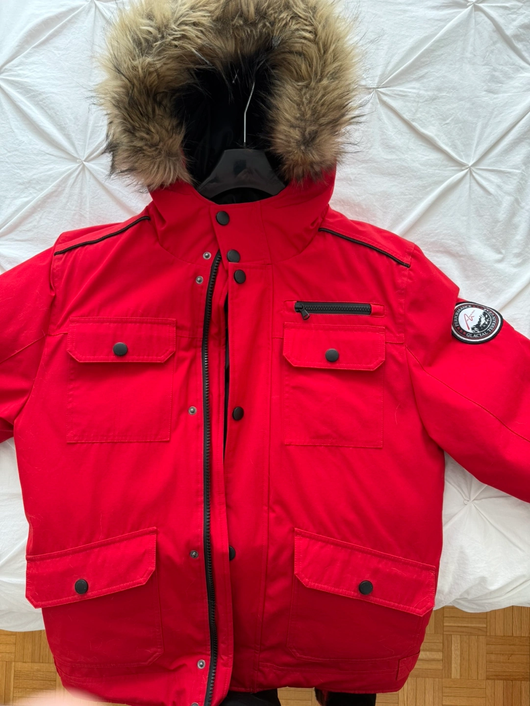 116Warm winter jacket. Red colour. Features a faux fur-lined hood, multiple pockets, and a durable water-repellent exterior. Down fill. Size small. Excellent for cold weather.
