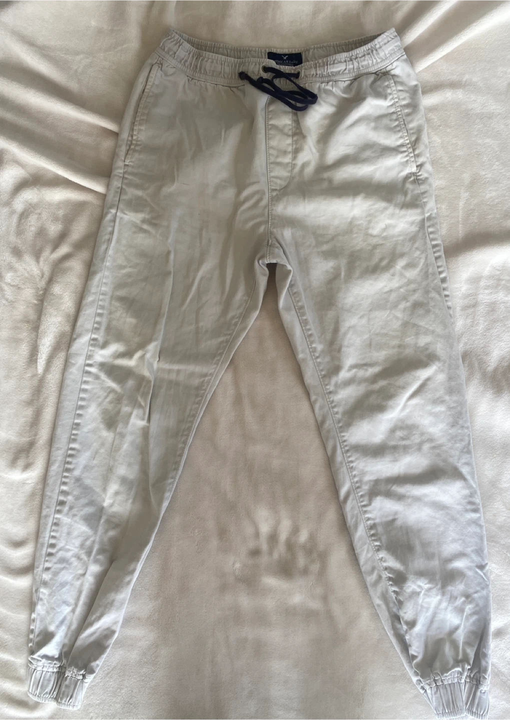 Selling a pair of American Eagle Outfitters joggers in a neutral colour! They're a size small and have a comfortable elastic waistband with a drawstring. Perfect for lounging or casual wear!