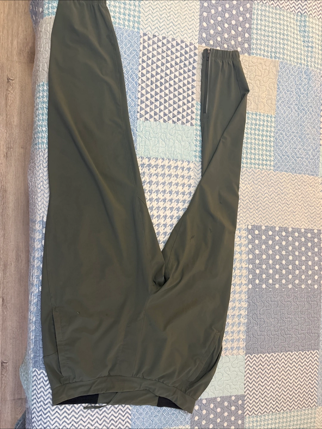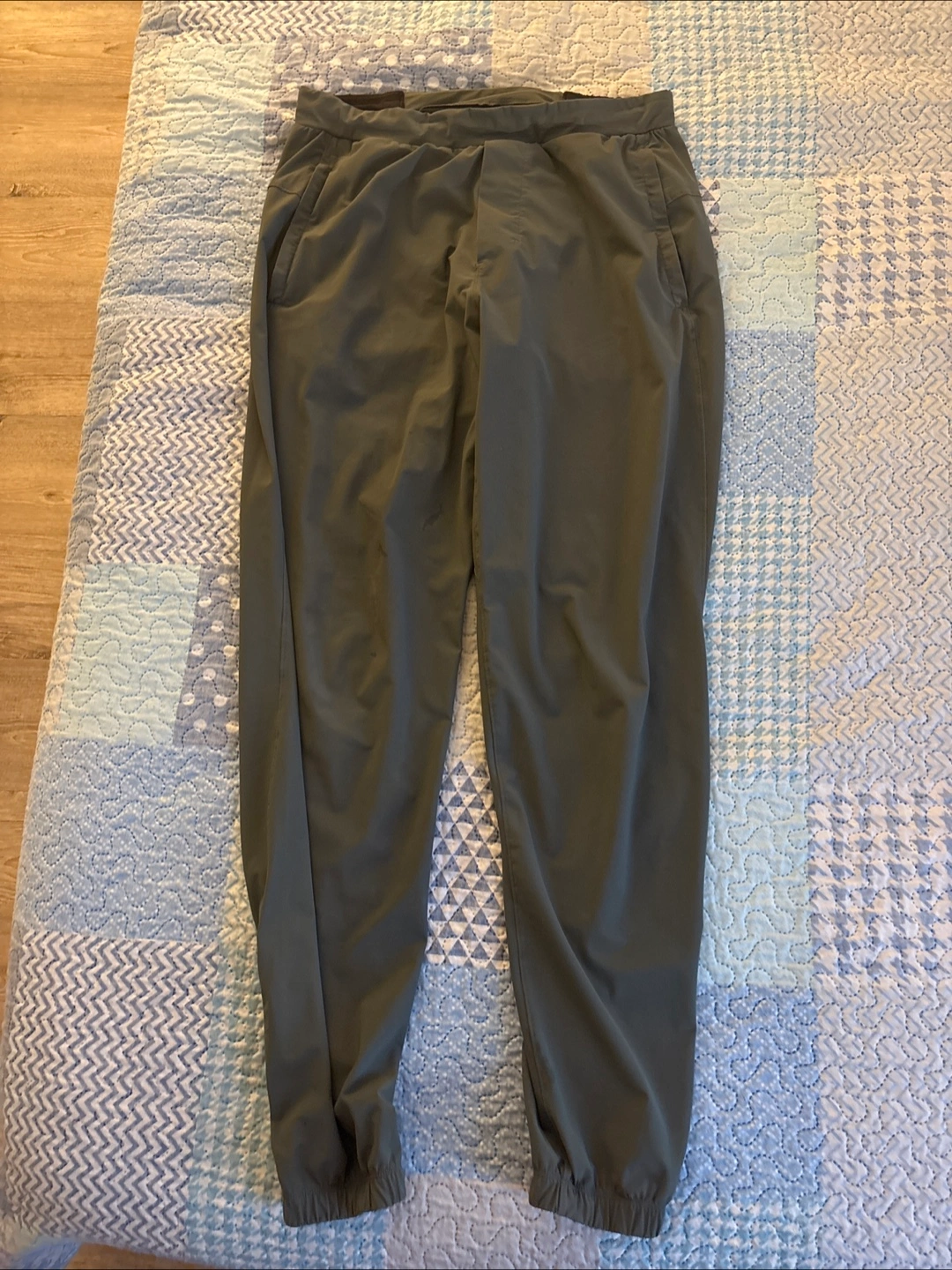 Lululemon surge jogger Pants in a olive colour. Features two front pockets. There are zippers at the ankles. You'll feel so relaxed wearing these for a leisurely walk. Pick up at Agincourt !